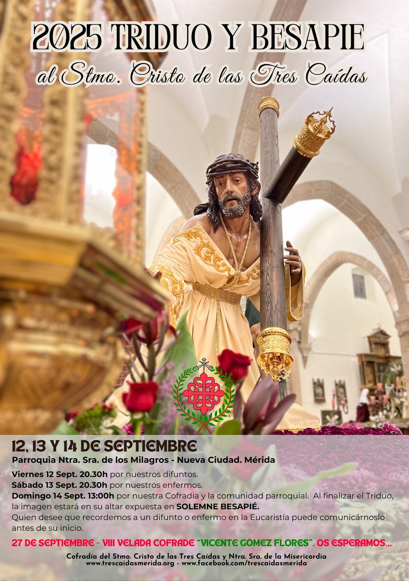 La Cofradía del Stmo. Cristo de las Tres Caídas y Ntra. Sra. de la Misericordia celebrará, los días 12, 13 y 14 de septiembre de 2025, el solemne Triduo en honor al Stmo. Cristo de las Tres Caídas en la Parroquia de Ntra. Sra. de los Milagros, en el barrio de Nueva Ciudad (Mérida).