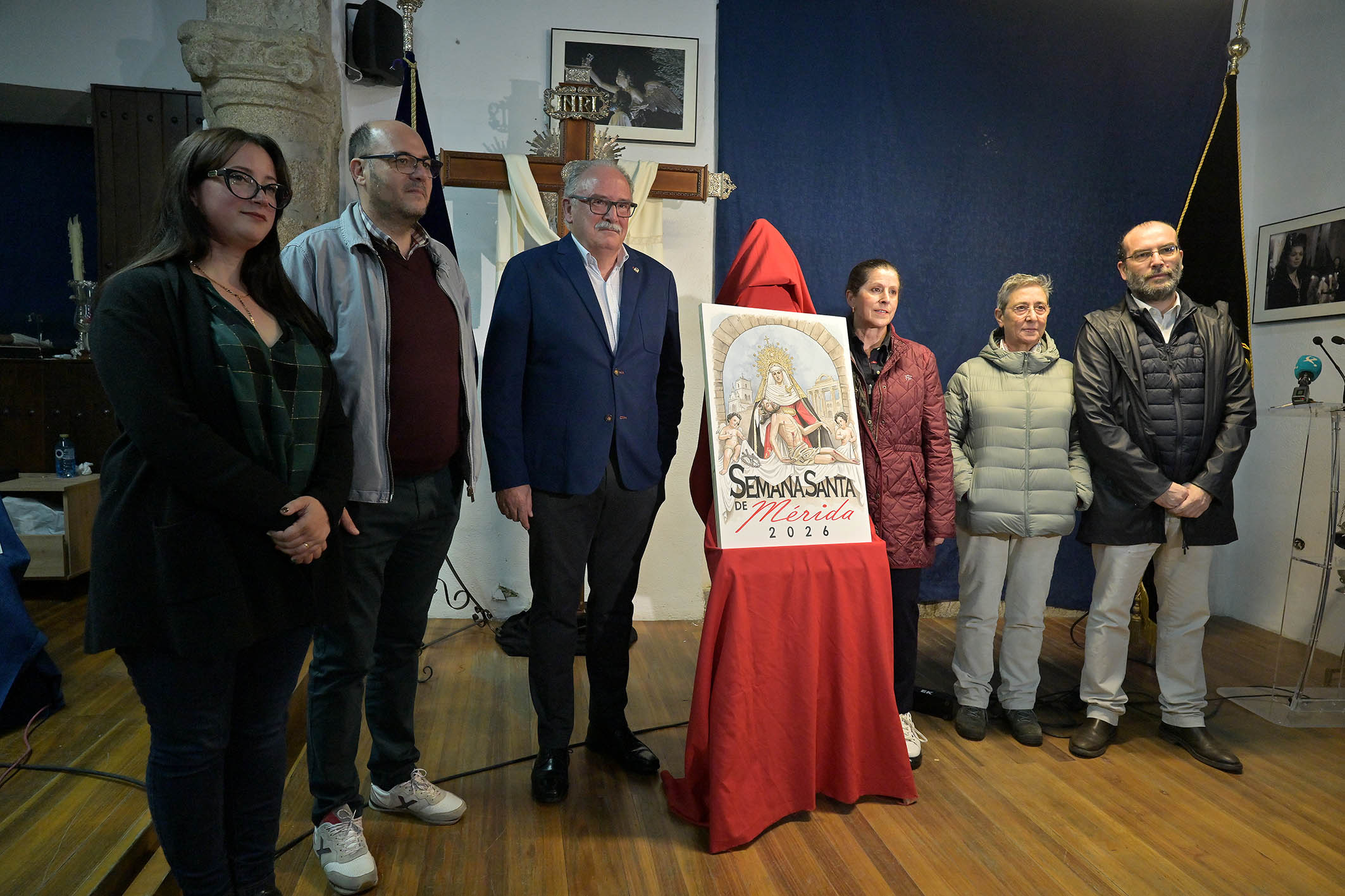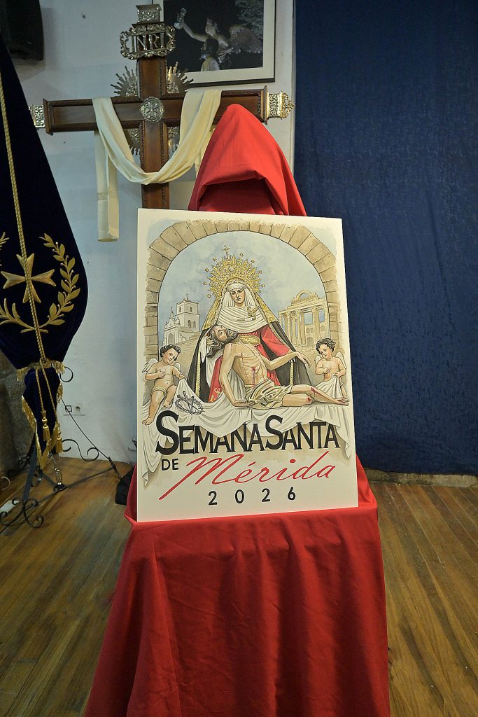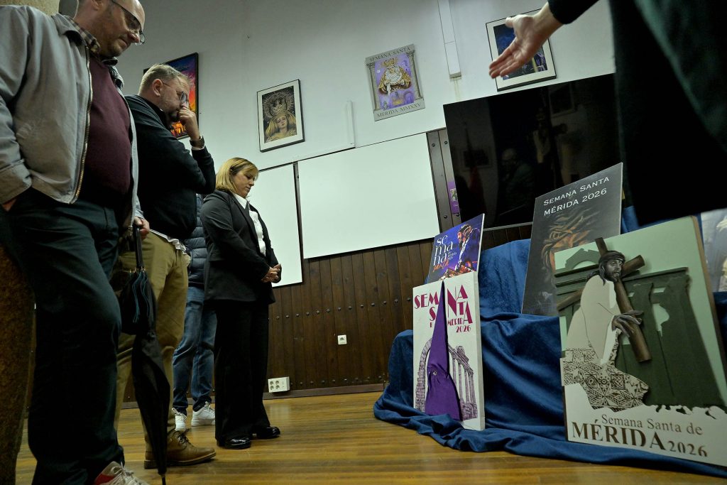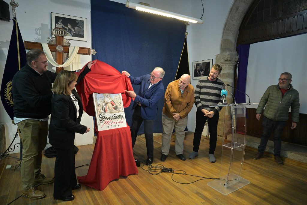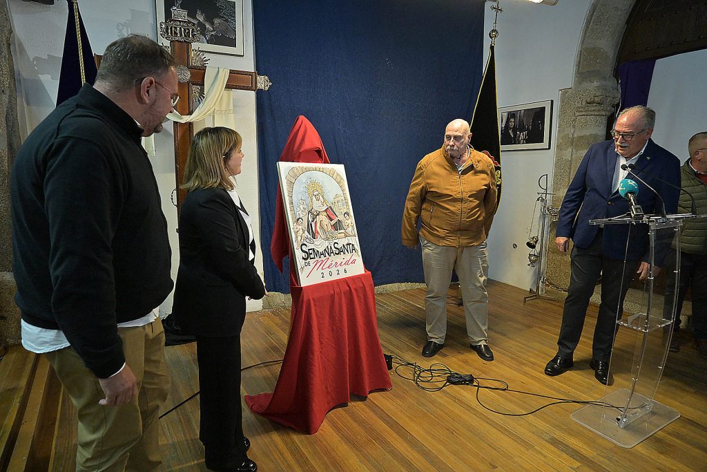 La sede de la Junta de Cofradías ha acogido, esta tarde, la presentación del cartel anunciador de la Semana Santa de Mérida 2026. Un acto que ha contado con la presencia del presidente de la Junta de Cofradías, Luis Miguel González, el alcalde de Mérida, Antonio Rodríguez Osuna, la delegada de Semana Santa, Ana Aragoneses, y los miembros del jurado del concurso de pintura que ha elegido el cartel anunciador.