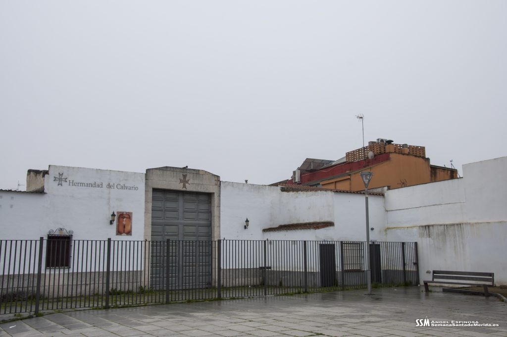 La ermita del Calvario está situada en la parte alta de la calle Calvario, o antigua calle de las Cruces, junto al Castellum Aquae, estructura de hormigón romano y sillares que probablemente fuera la torre desde la que se distribuyeran, por toda la zona norte de Augusta Emerita, las aguas procedentes de la conducción hidráulica de Proserpina.