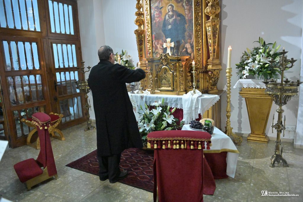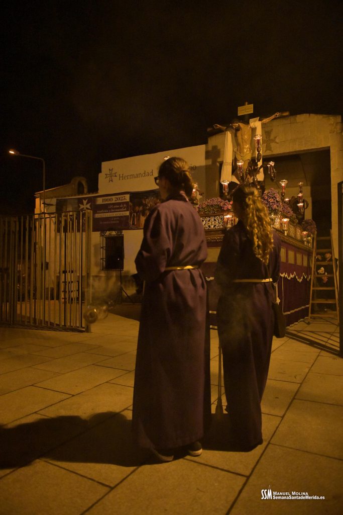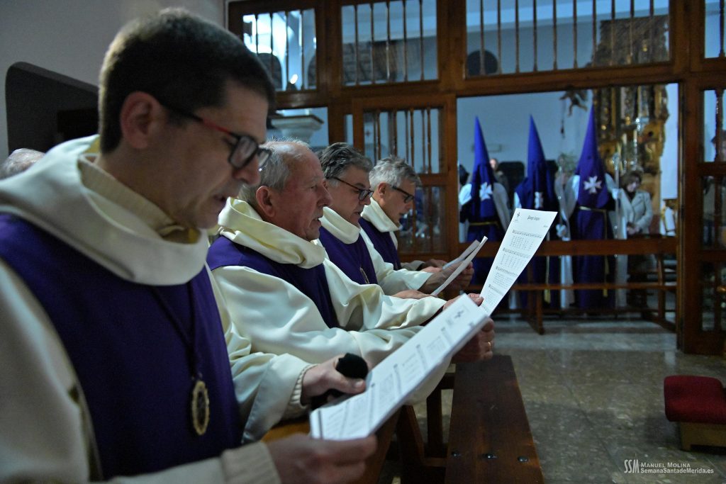 Una vez llega el Stmo. Cristo del Calvario a su Parroquia, una representación de la Junta de Gobierno de la Hermandad, junto con el sacerdote y la Capilla Gregoriana, entran a orar ante el Santísimo Sacramento y todos aquéllos que lo desean, entran también en el templo para unirse y vivir unos instantes de canto, rezo y meditación.