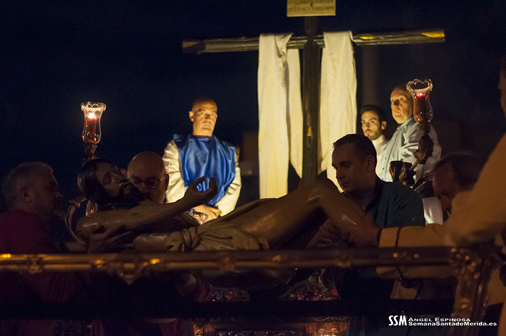 Una vez llegamos de vuelta a la Ermita, sabemos que llega el momento en el que la emoción aviva al alma y, entre la oración y el canto, se realiza el descendimiento del cuerpo inerte del Cristo del Calvario. No es espectacular, no es algo que inunde los sentidos, tal y como estamos acostumbrados a día de hoy. Al contrario, es un acto sobrio, sereno, profundo, plásticamente bello y sobrecogedor para aquéllos que hemos tenido la suerte de poder realizarlo y haber tenido en nuestras manos el peso del Señor. Los recuerdos brotan.