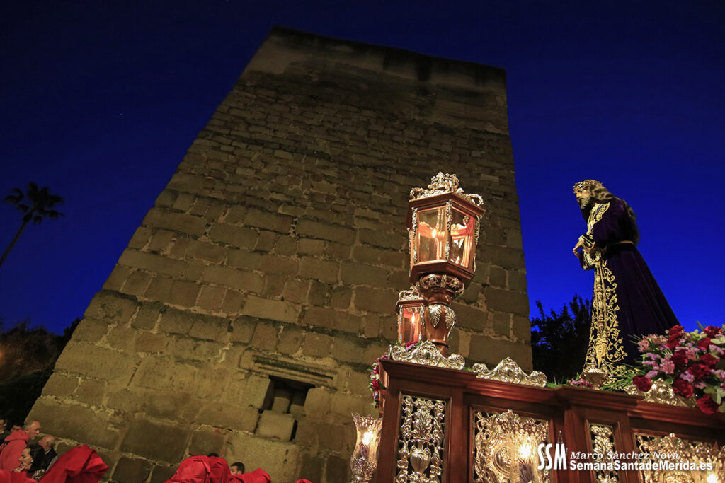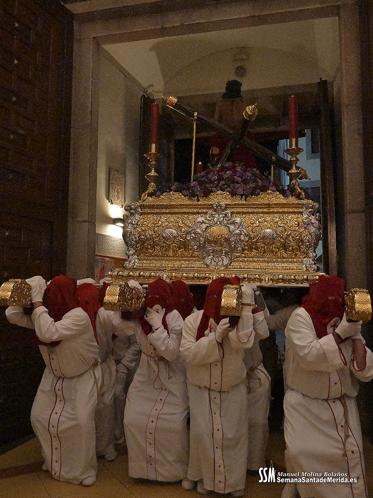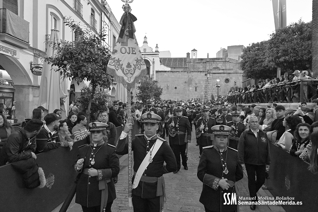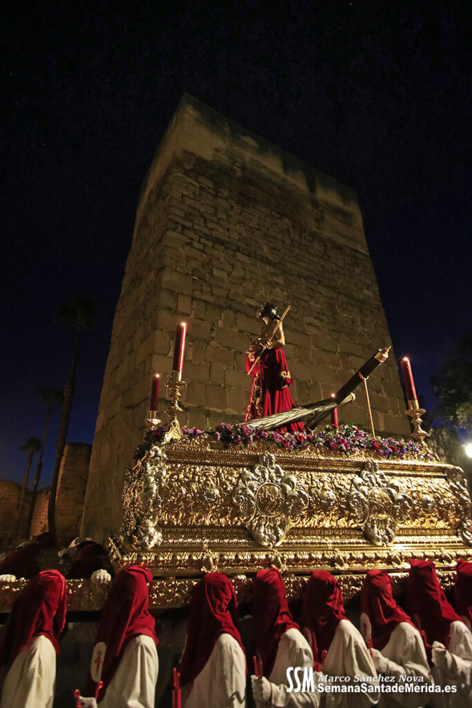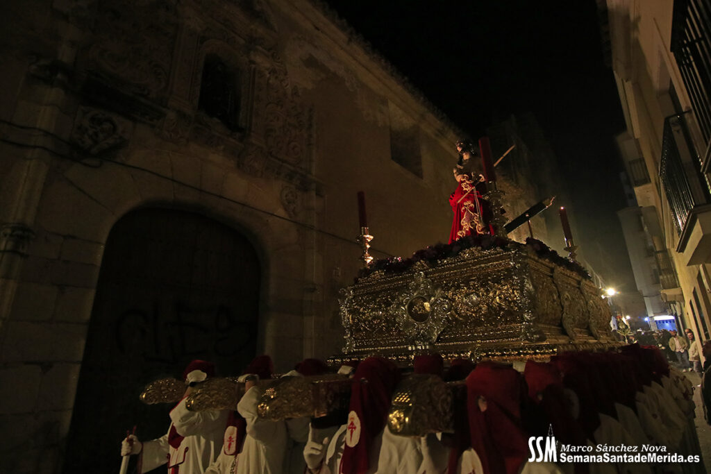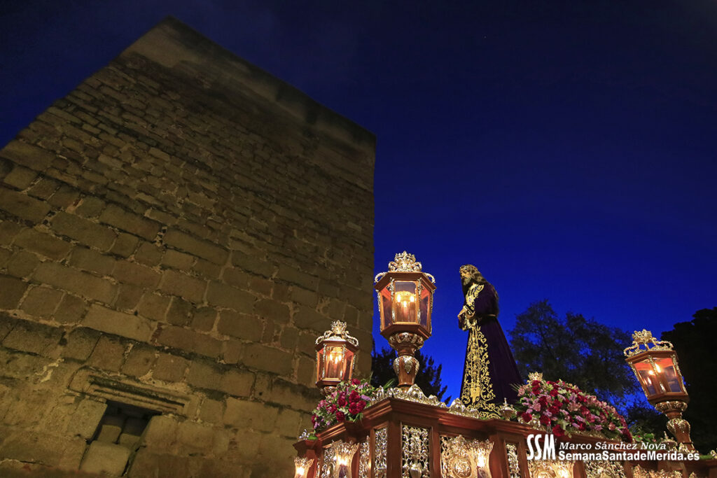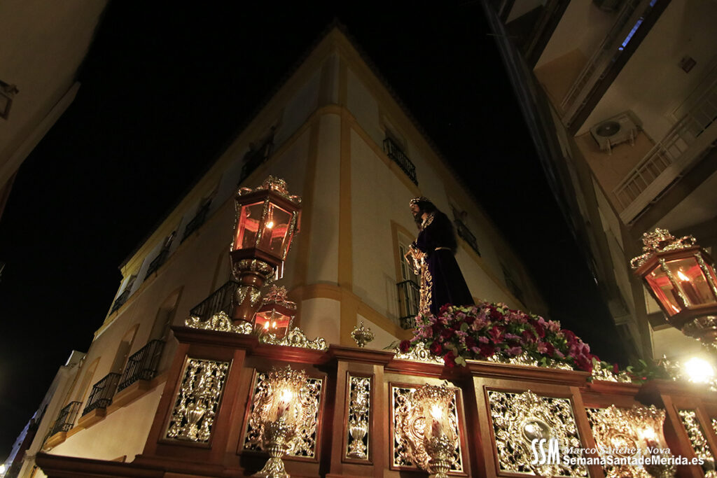 Nuestro Padre Jesús de Medinaceli avanzó con una elegancia incontestable. Su caminar, solemne y pausado, se mecía al compás de los sones de la Banda de Cornetas y Tambores de la OJE de Mérida, que supo poner música al recogimiento y a la profundidad de cada mirada.