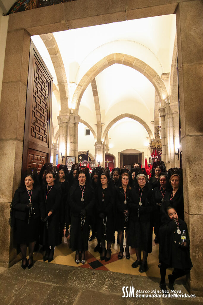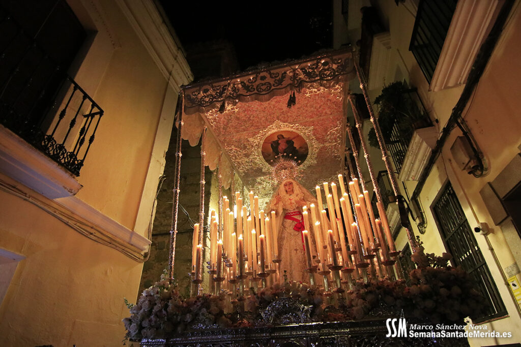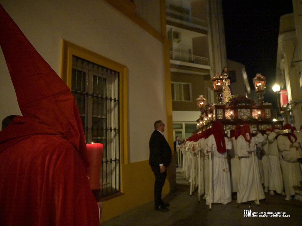 El cortejo, larguísimo, hablaba por sí solo del crecimiento y la fuerza de esta Cofradía. Nazarenos, penitentes y damas de la Virgen dibujaban un río de fe que se deslizaba por las calles emeritenses con orden, respeto y una belleza difícil de describir.