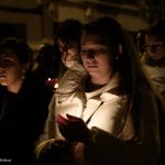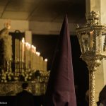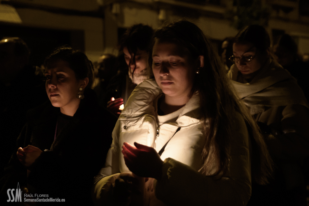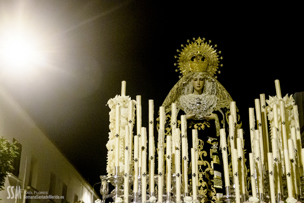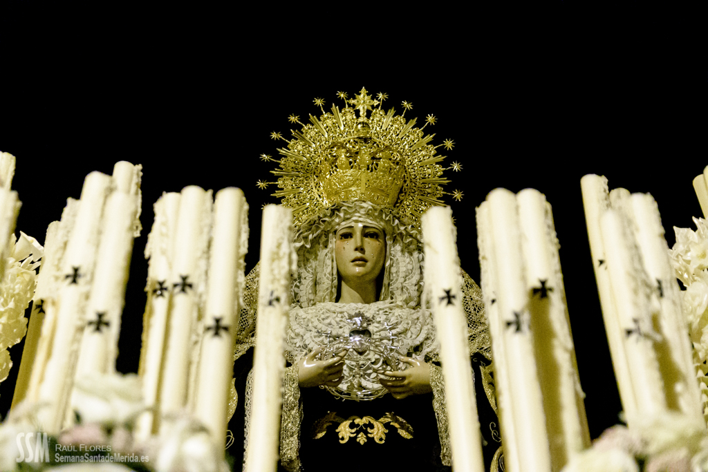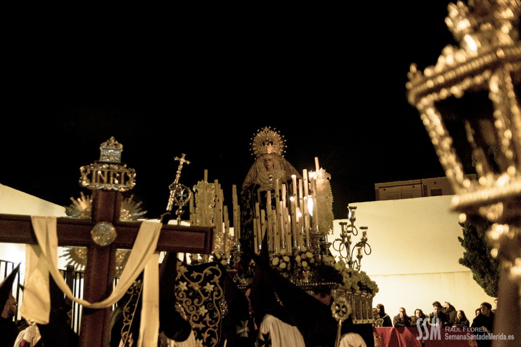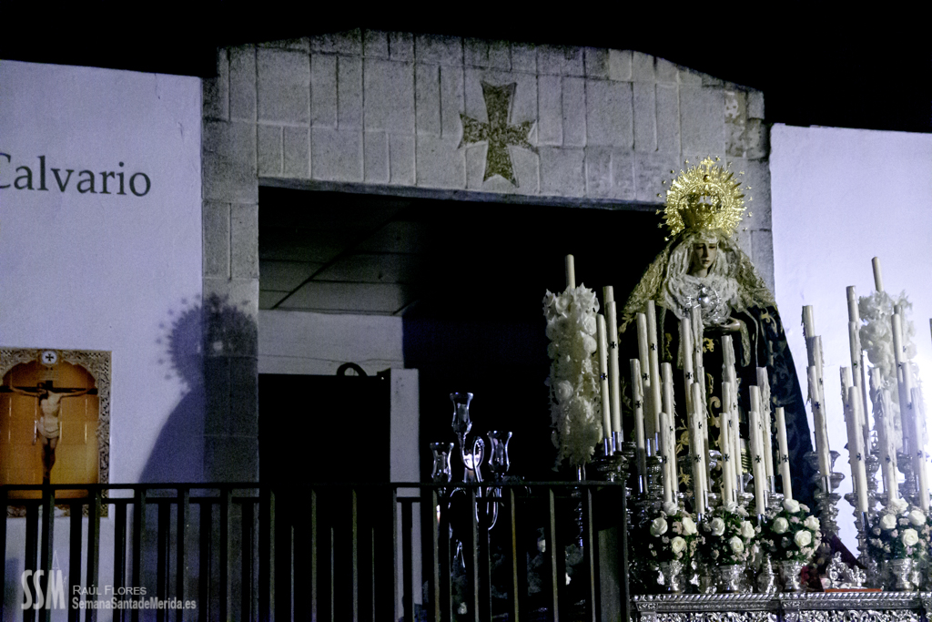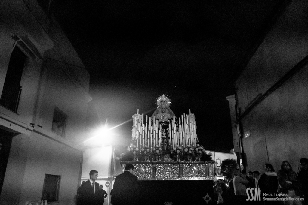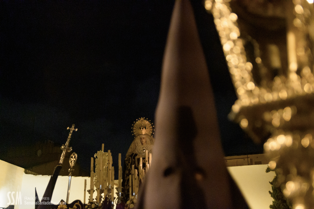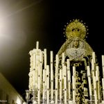 Continua su camino por las calles del Barrio, de ese Barrio que la ha acogido en su casa después de estar toda una vida en la Concatedral de Santa María, en silencio. Tan sólo se oye el rachear de pies de los costaleros, de esos costaleros que la llevan por su barrio. Y todo el barrio y su cofradía la acompañan en este caminar en soledad, tan sólo acompañada por la luz de algunas velas que llevan algunas mujeres, hacia la esperanza de la Resurrección.
