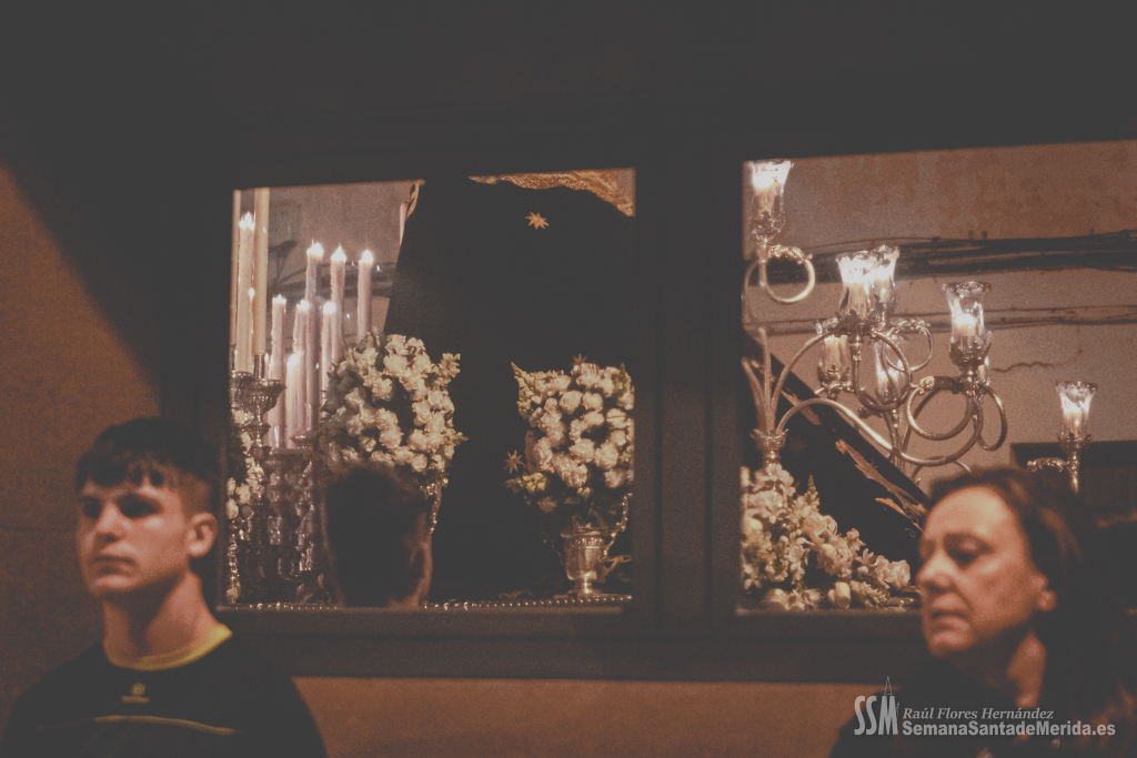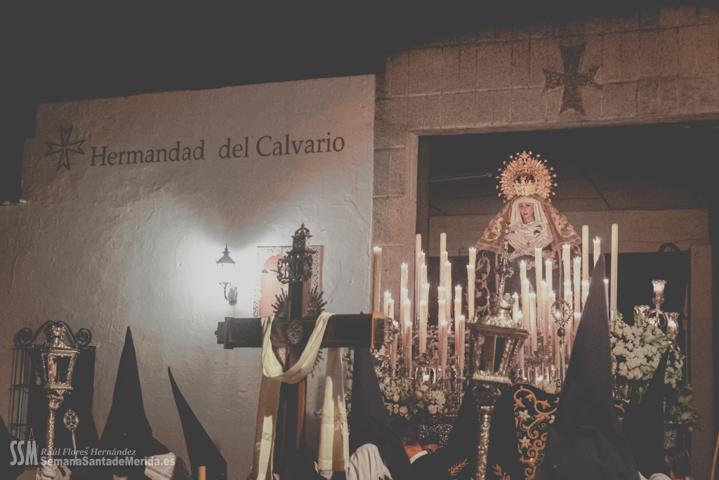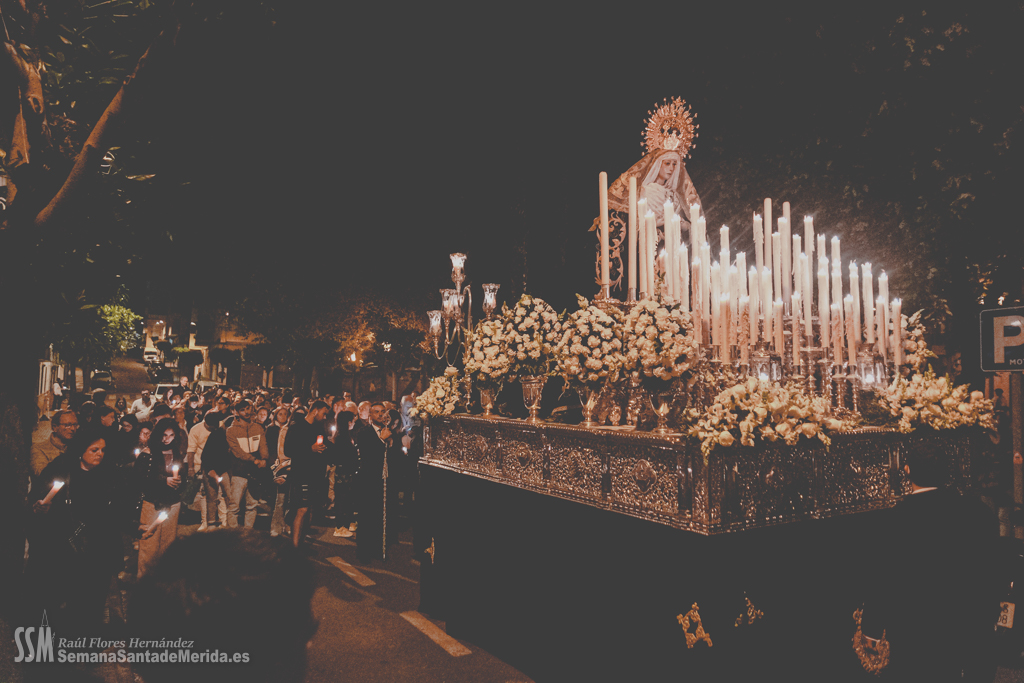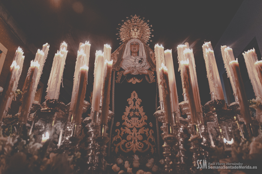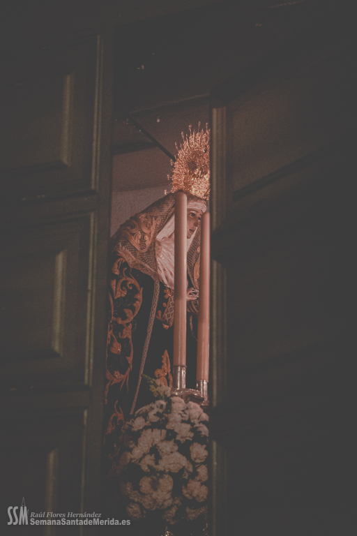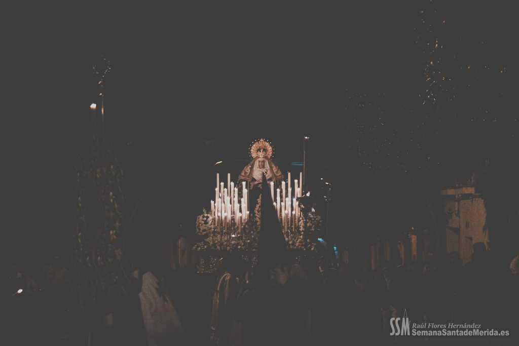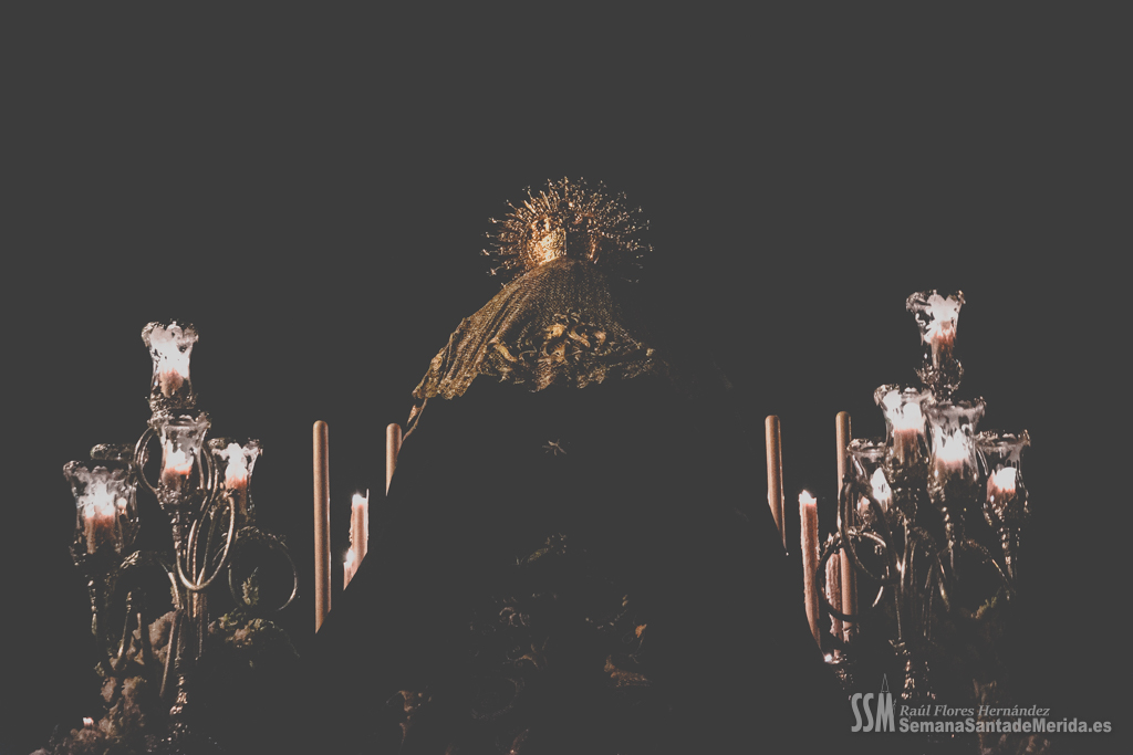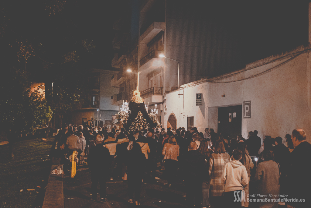Sin palio, desamparada y humilde lloraba por la muerte de su hijo sobre los hombros de esos costaleros que con orgullo lo portan cada noche del Viernes Santo y que sabían que les espera un largo tiempo hasta que vuelvan a levantarla y a llevarla con ese cariño tan característico que se tiene por una madre. Por cada rescoldo de las primitivas calles del barrio, entraba un aire que estremecía a quien le acompañaba. El correr de varias persianas resonaba a su paso por las calles pues es lo último que los vecinos esperaban ver en una noche de Viernes Santo y los vecinos abrían las ventanas para que uno de los últimos suspiros de la Semana Santa entrase en sus hogares.