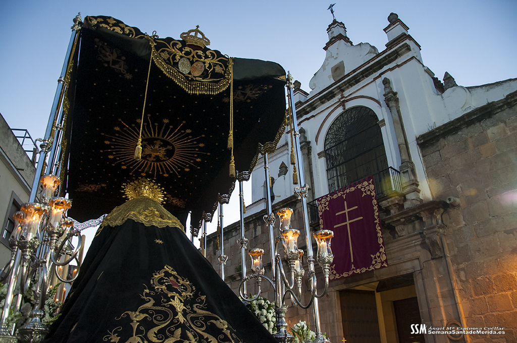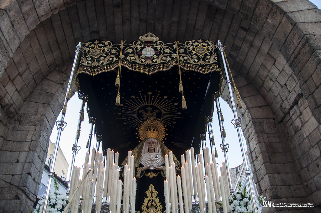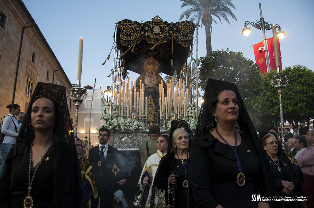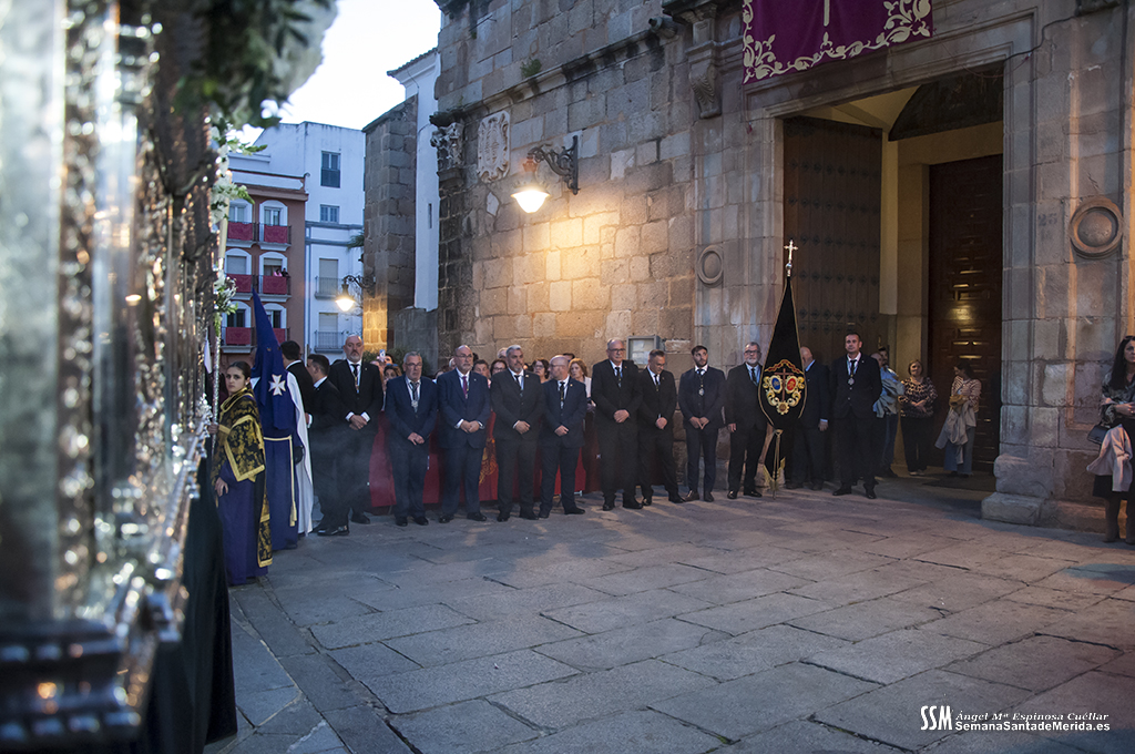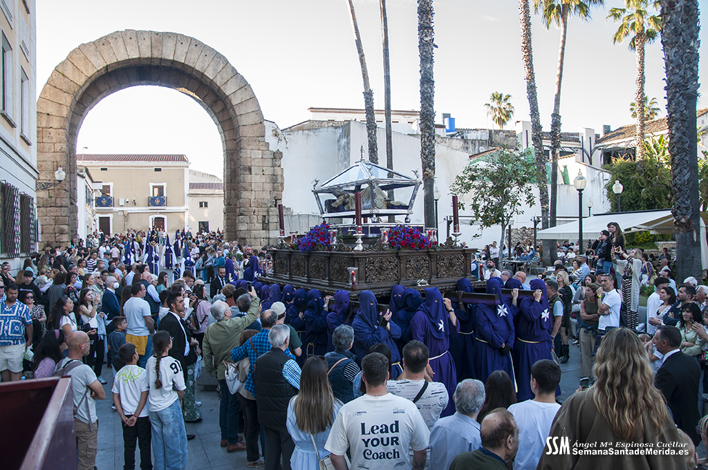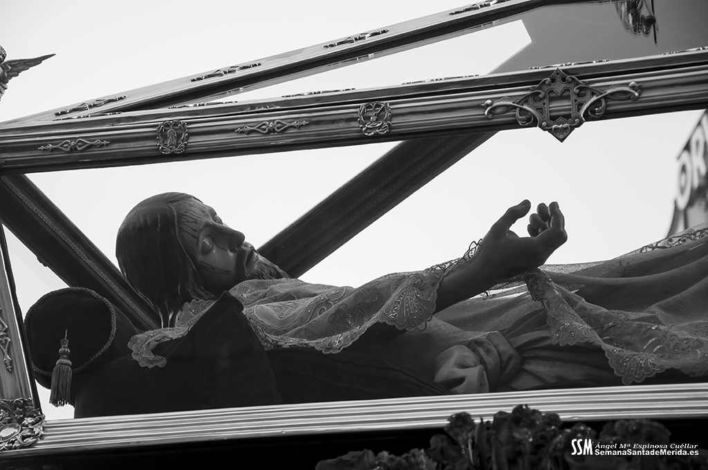 Autoridades, cofradías y pueblo caminaban unidos, fundidos en un mismo sentimiento, acompañando al Cristo Yacente que reposaba en su impoluta urna de cristal y plata, reflejo silencioso de la muerte que sobrecoge. Tras Él, la Santísima Virgen de los Dolores, “La Señora de Mérida”, como la nombran con devoción los libros de actas del municipio, sostenía con su mirada el peso de todos los dolores del mundo.
