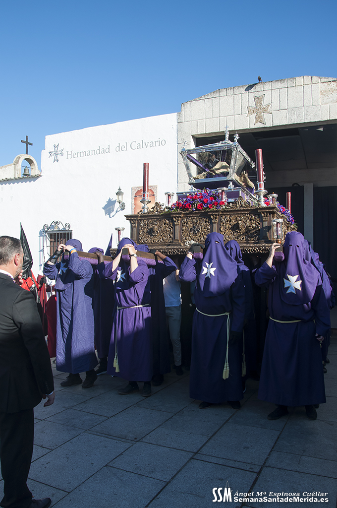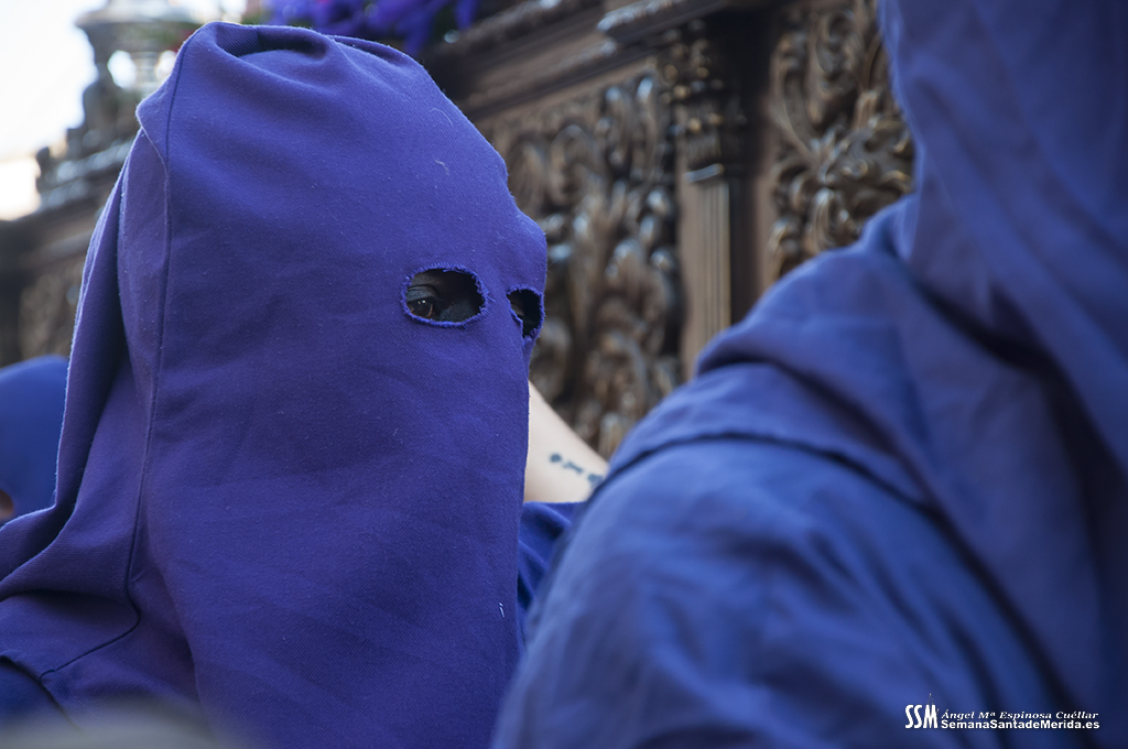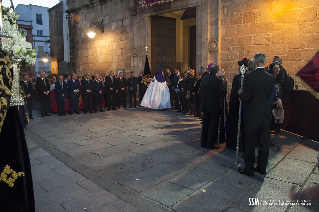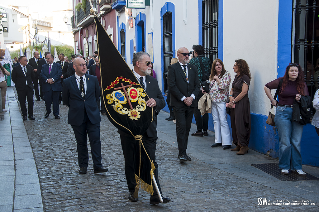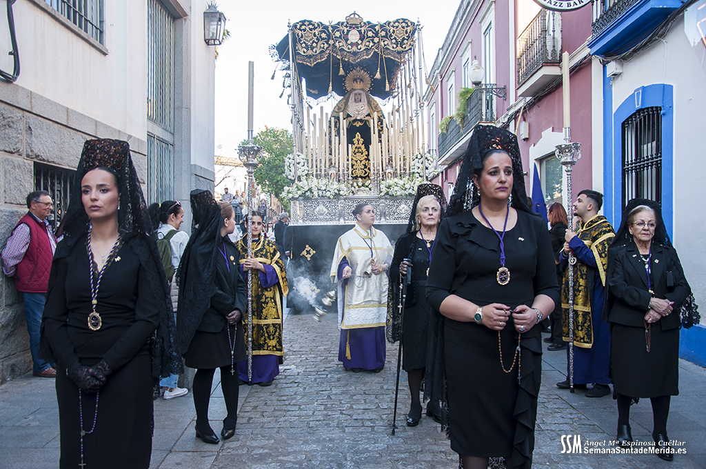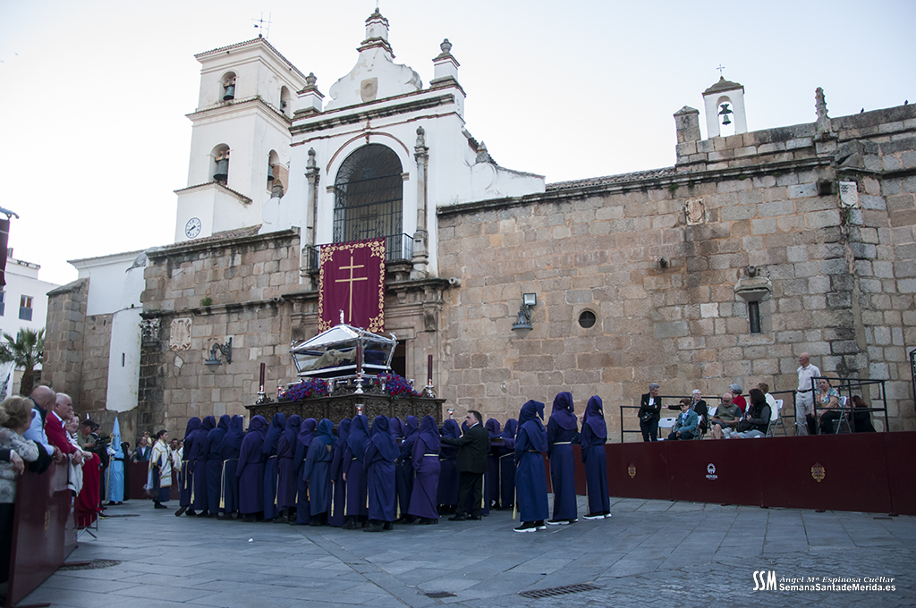 Autoridades, cofradías y pueblo caminaban unidos, fundidos en un mismo sentimiento, acompañando al Cristo Yacente que reposaba en su impoluta urna de cristal y plata, reflejo silencioso de la muerte que sobrecoge. Tras Él, la Santísima Virgen de los Dolores, “La Señora de Mérida”, como la nombran con devoción los libros de actas del municipio, sostenía con su mirada el peso de todos los dolores del mundo.