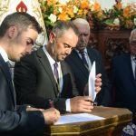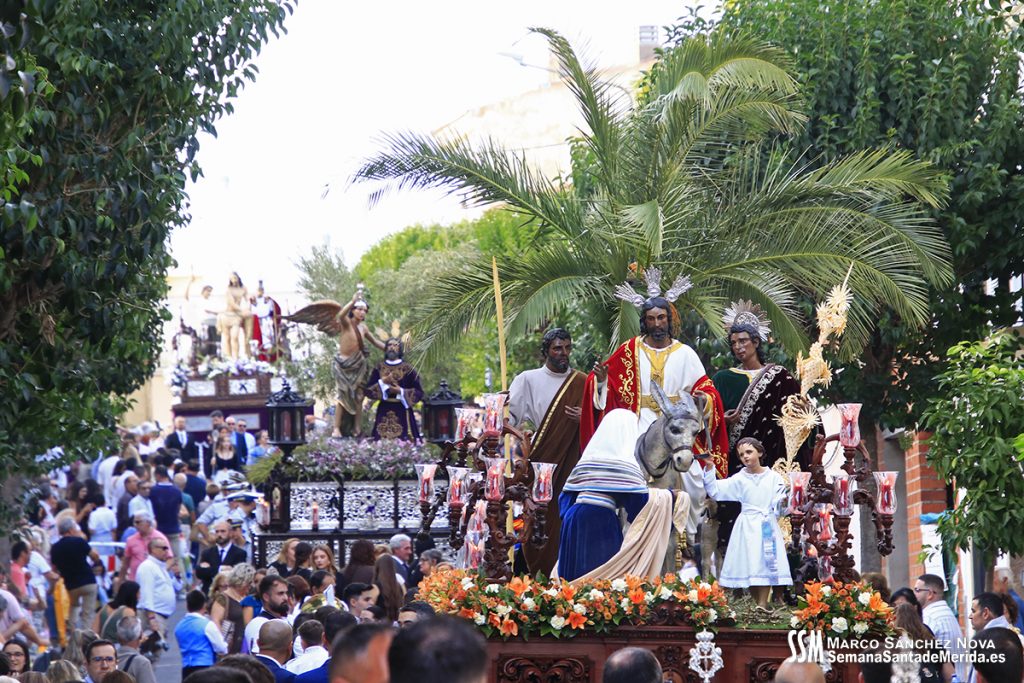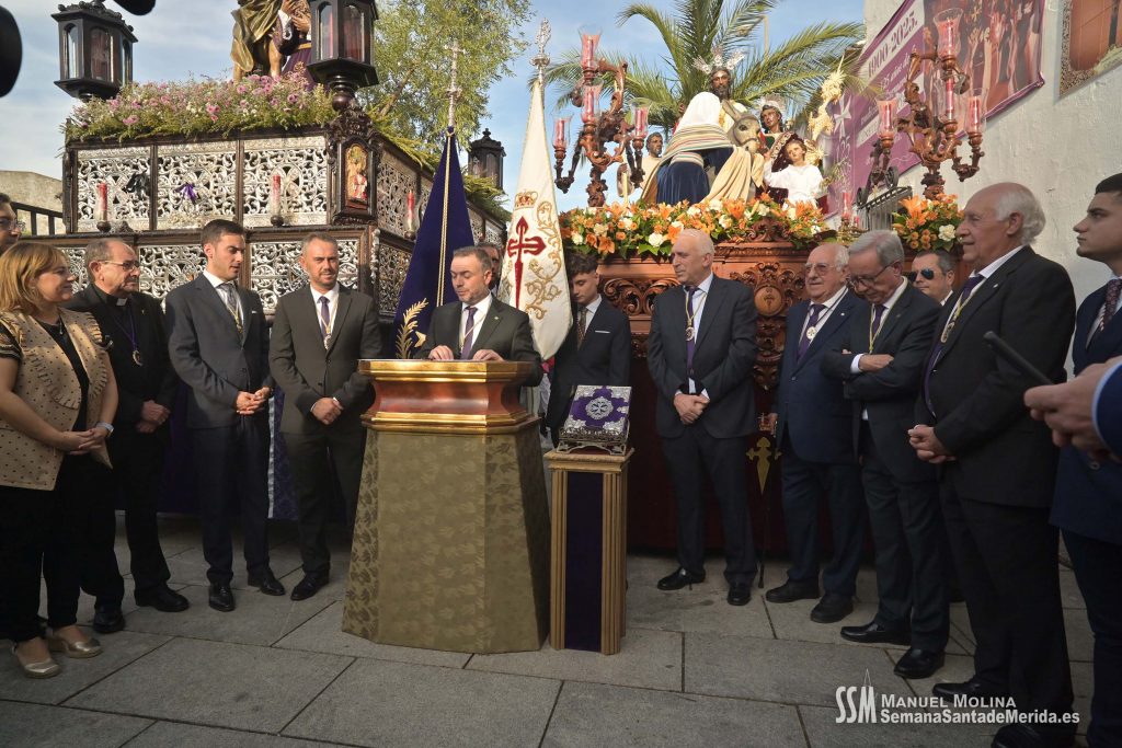 La tarde comenzó solemne con la rúbrica del acuerdo de cesión, por parte de la Hermandad del Calvario a la Cofradía Infantil, del grupo escultórico de la Entrada en Jerusalén que se realizó momentos antes del inicio del cortejo procesional. De esta manera, y en presencia de cinco ex Hermanos Mayores de la Hermandad del Calvario, y un ex Hermano Mayor de la Cofradía Infantil, ante sus Juntas de Gobierno, y el público asistente, se reafirmó el hermanamiento entre ambas hermandades, no en vano, los infantiles son los herederos del Calvario, fruto de la semilla sembrada en su día, como en la parábola del grano de mostaza.