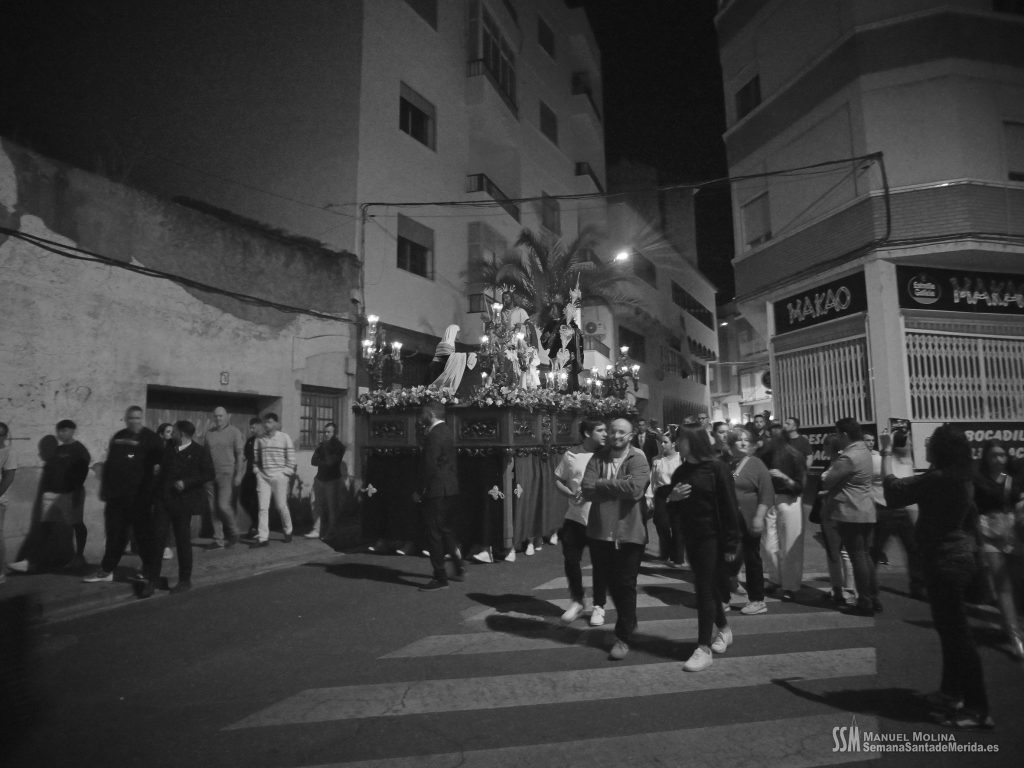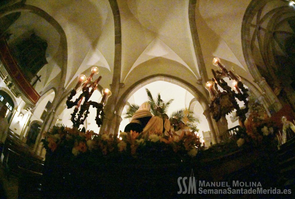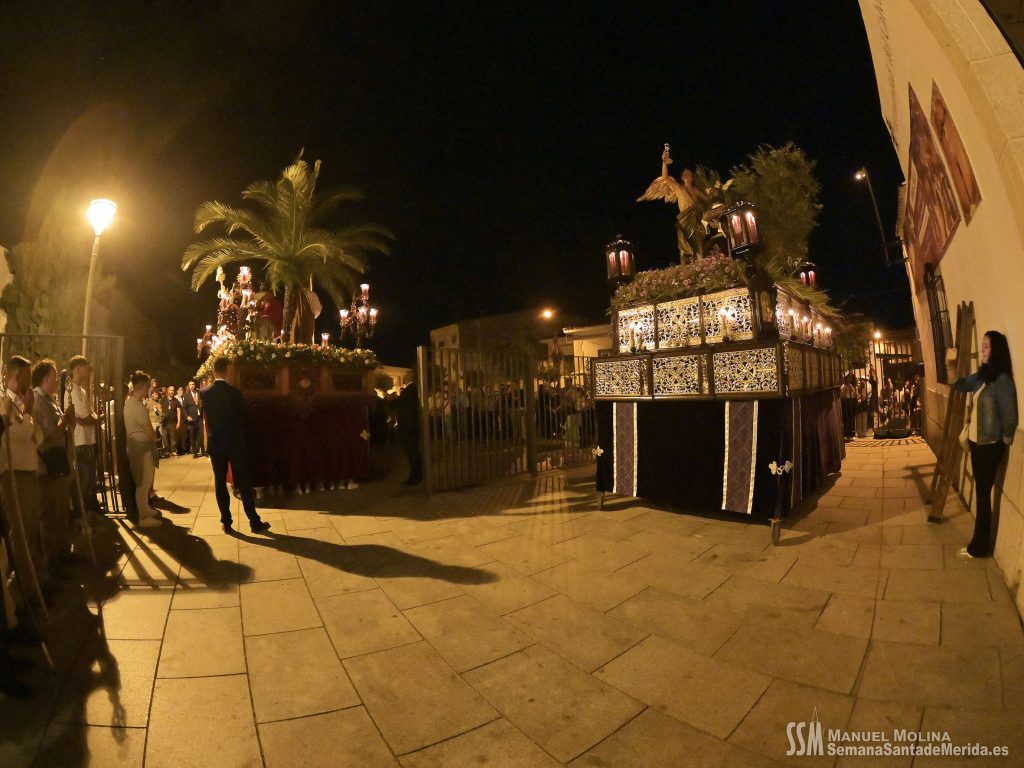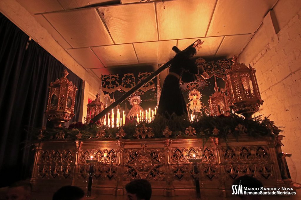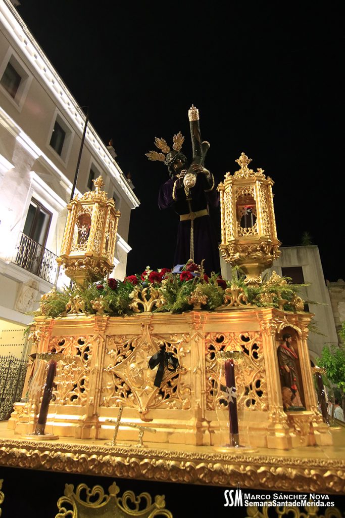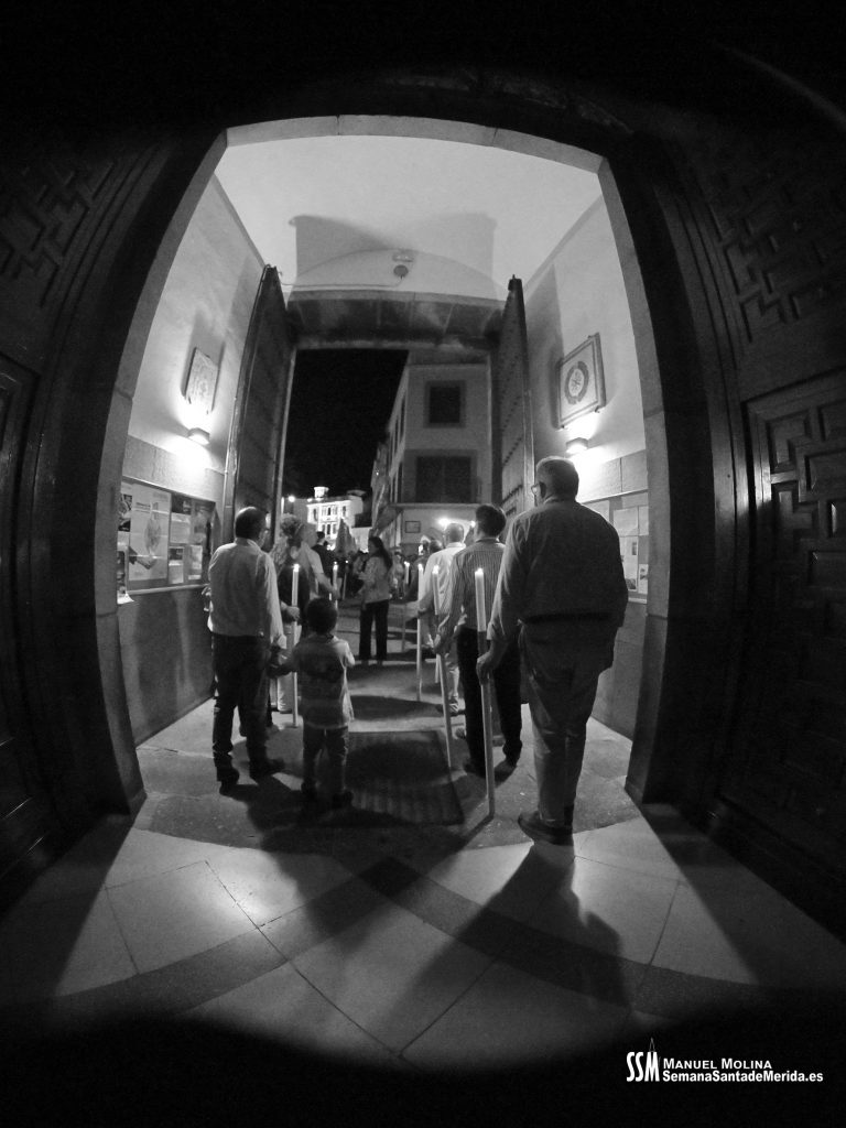 En silencio, avanzaba el Santísimo Cristo del Calvario, origen de la Cofradía, en su urna de plata de Meneses. Una estampa que lleva repitiéndose en Mérida durante siglos, por ello hablamos de historia, no solo de la Hermandad, sino de su Ermita, su calle… etc. Y delante del paso, el hermano mayor más antiguo de la Hermandad, D. Ángel de las Heras Espino, quién a su vez fuera su capataz, sin perder detalle del avanzar del mismo y, sobre todo, rubricando la historia de la Hermandad, refrendada por sus sucesores, Isidro Anguas y Fernando Carrasco, que avanzaban ante el paso del Nazareno o Antonio Chaparro, en la Virgen de los Dolores ¡Toda una lección de historia cofrade.