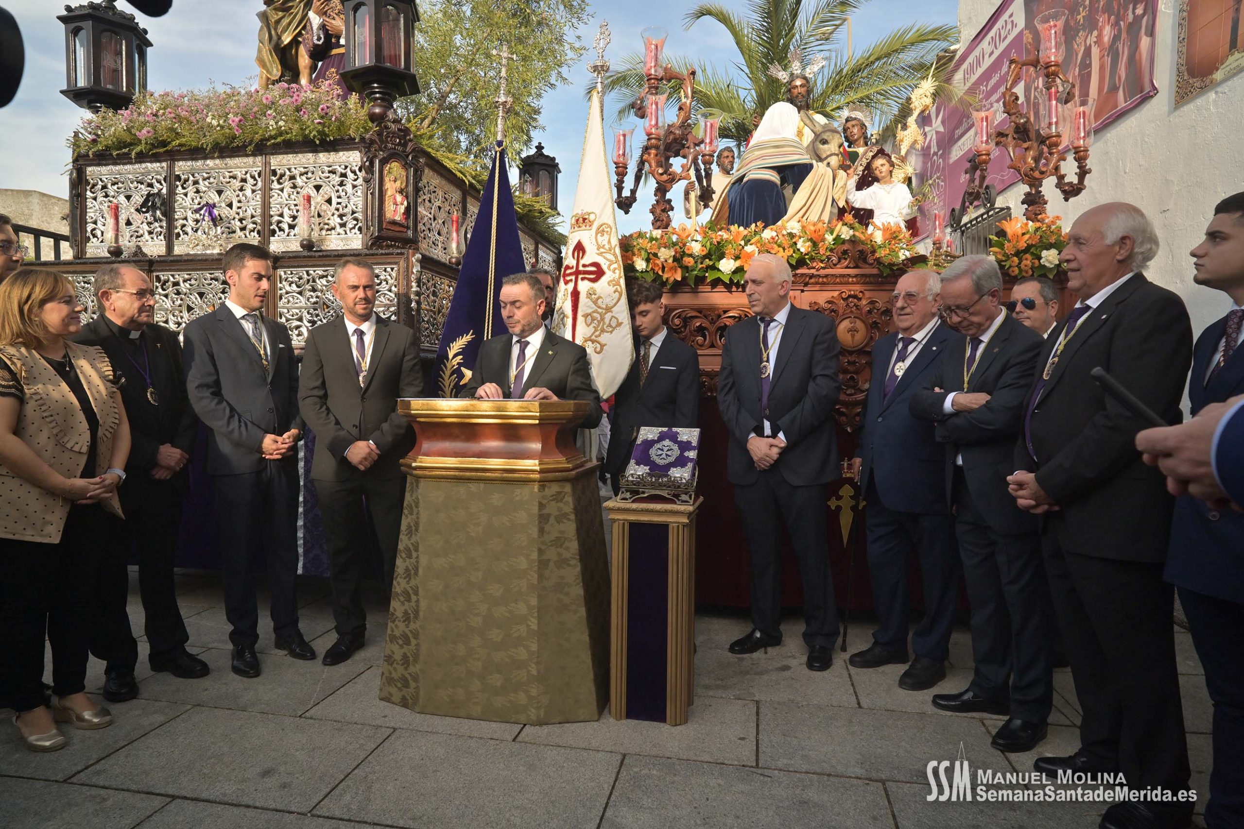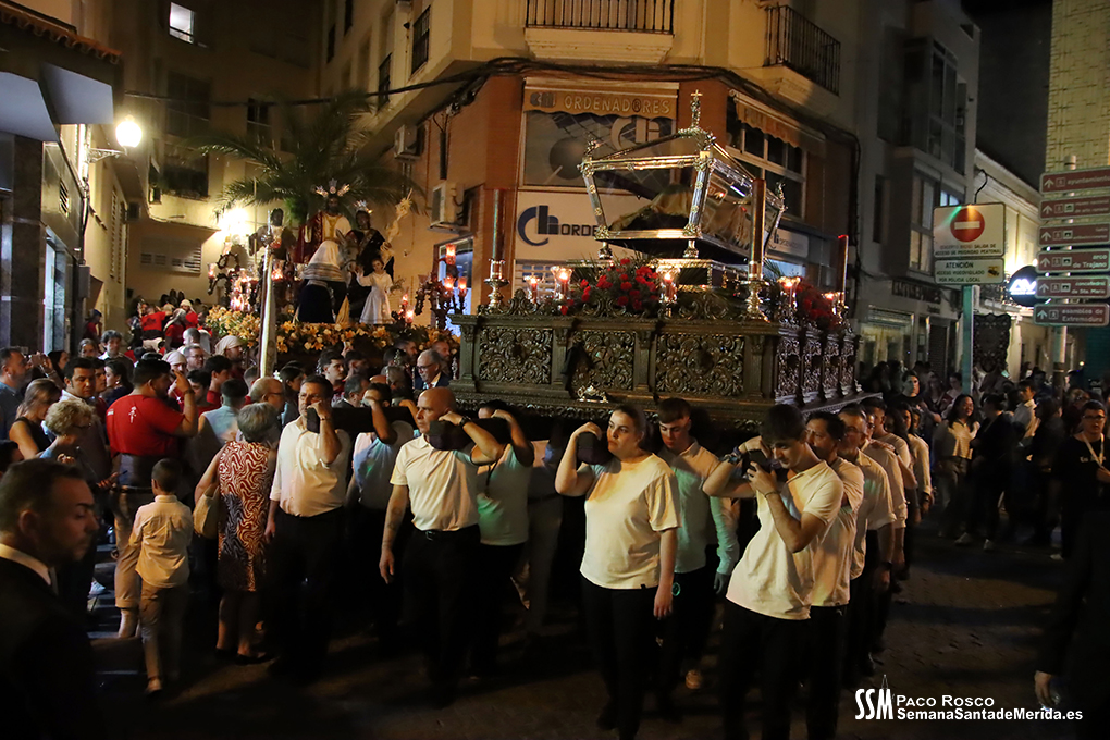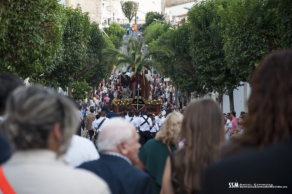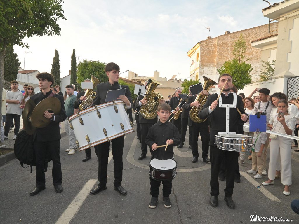 A partir de ahí, las numerosas insignias de la hermandad centenaria fueron conformando los tramos de cada uno de los pasos que participaron en el magno cortejo. De esta manera, el Libro de Reglas de la hermandad antecedía al paso de la Oración en el Huerto, con el Cristo luciendo su túnica primitiva, a los sones de la Banda de Cornetas y Tambores de la OJE de Mérida.