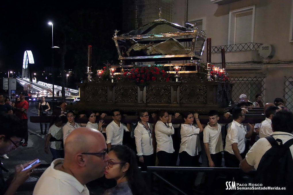 Tras ella, las Hermandades y Cofradías, en orden de antigüedad, así como las asociaciones religiosas, convirtieron la tarde en el tradicional Viernes Santo emeritense. La Junta de Cofradías iba avanzando ante el Yacente que, en su gran mayoría, fue portado por mujeres.