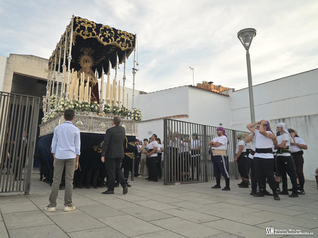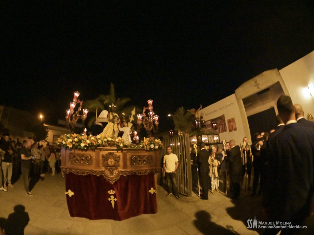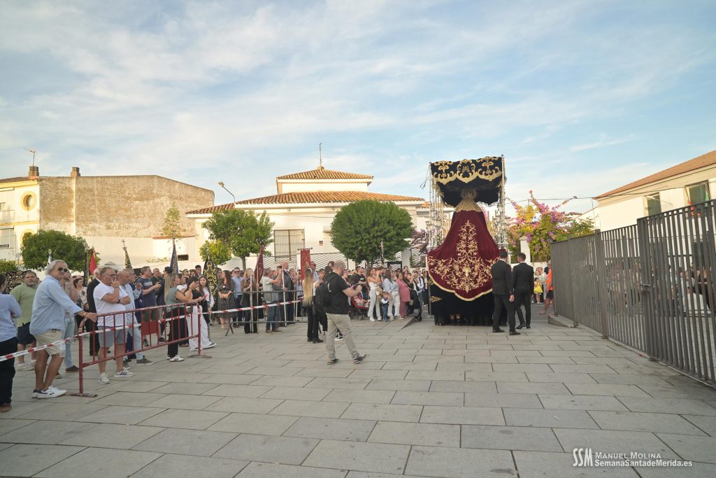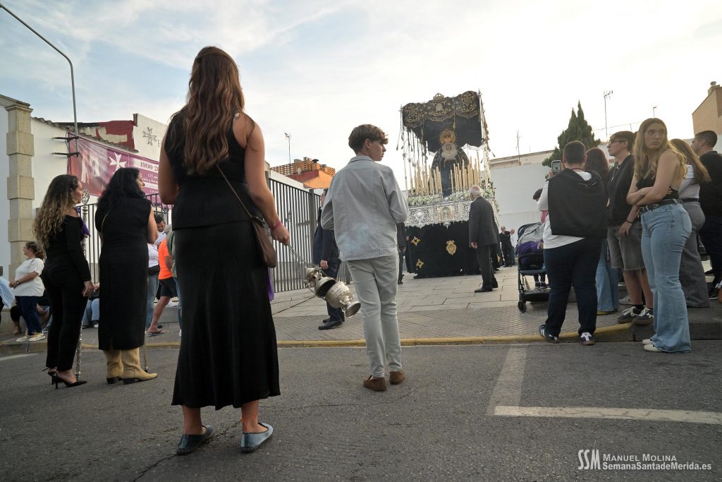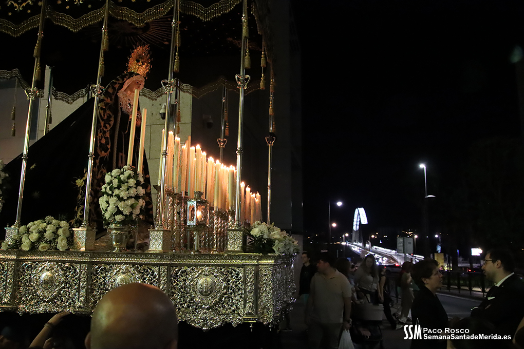 Finalmente llegó, oficialmente, la Hermandad del Calvario. El estandarte de la Virgen de los Dolores abría el último tramo, como cada Viernes Santo, anunciando la presencia de quien, por acuerdo plenario, es la ,»Señora de Mérida». La Banda de Música de Mérida aportaba sus acordes al solemne y elegante caminar de la Virgen de los Dolores contrastado con el soberbio andar de la Virgen de la Amargura, que era todo un derroche de alma de barrio.