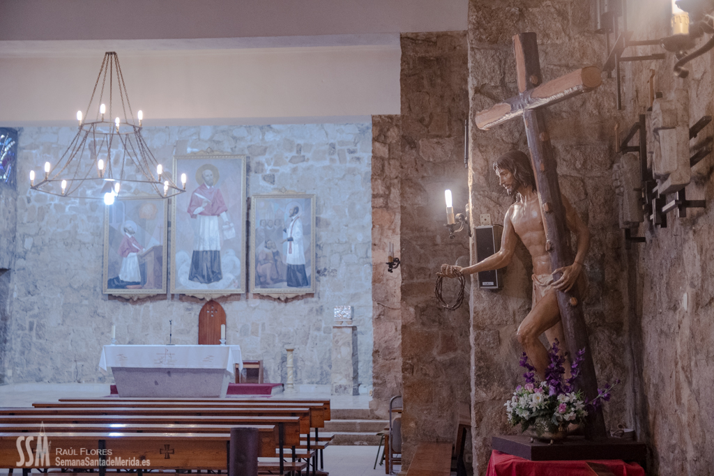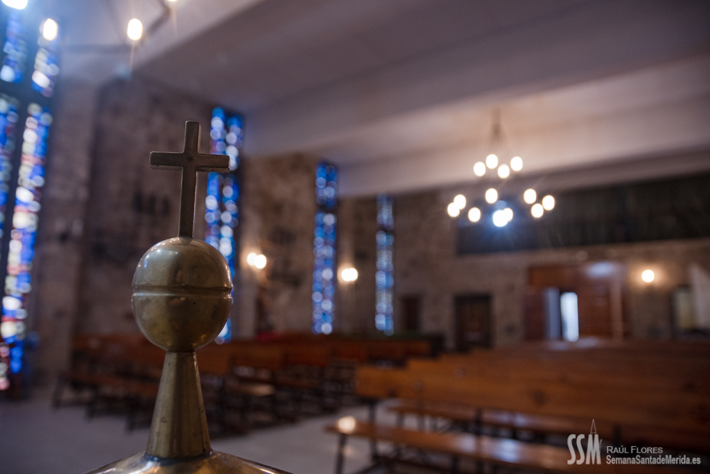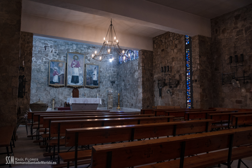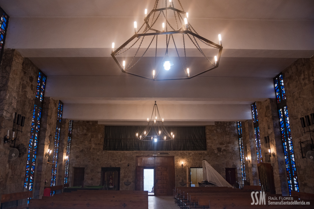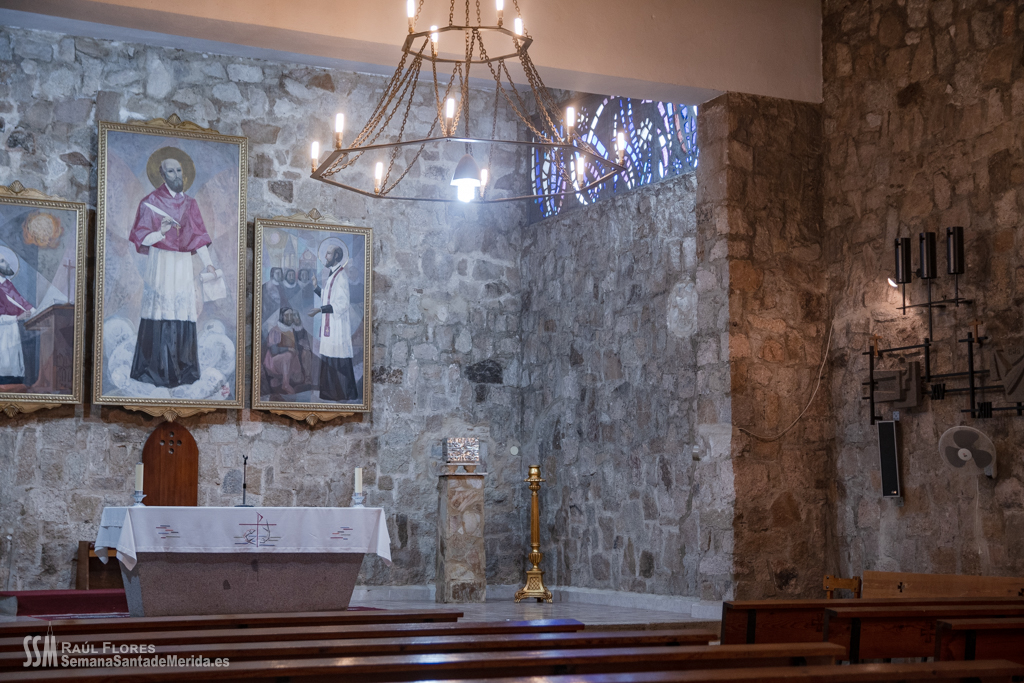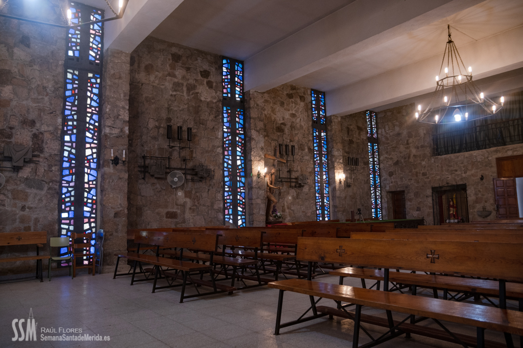 El presbiterio acoge tres cuadros del pintor Julián Pérez Muñoz que que reflejan la vida de San Francisco de Sales. Junto a la puerta de entrada se abre una pequeña capilla, forrada en madera, que acoge las imágenes titulares del paso del “Prendimiento de Jesús” de la Cofradía del Prendimiento de Jesús y Ntra. Señora de la Paz, labrada en madera maciza policromada, realizada en 1956 por el escultor emeritense Juan de Ávalos