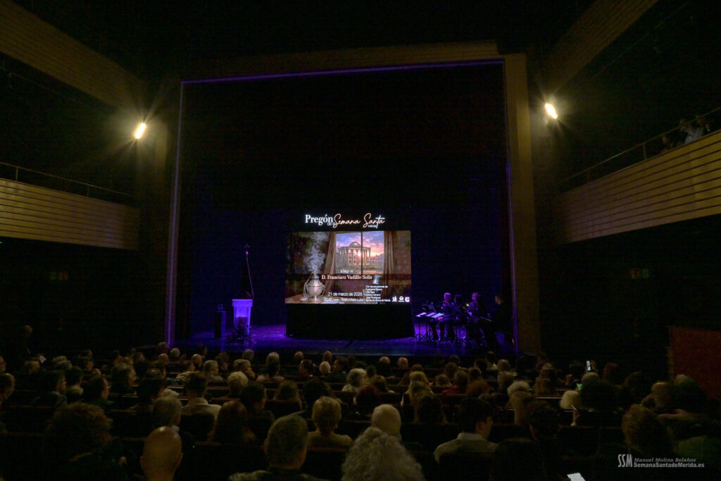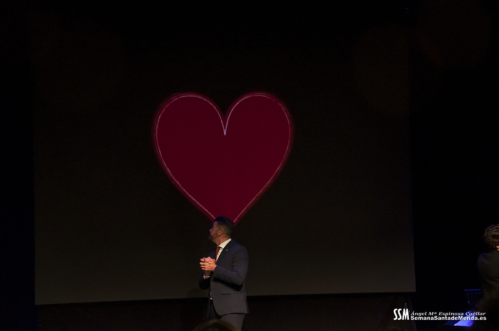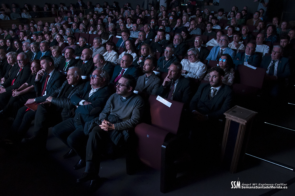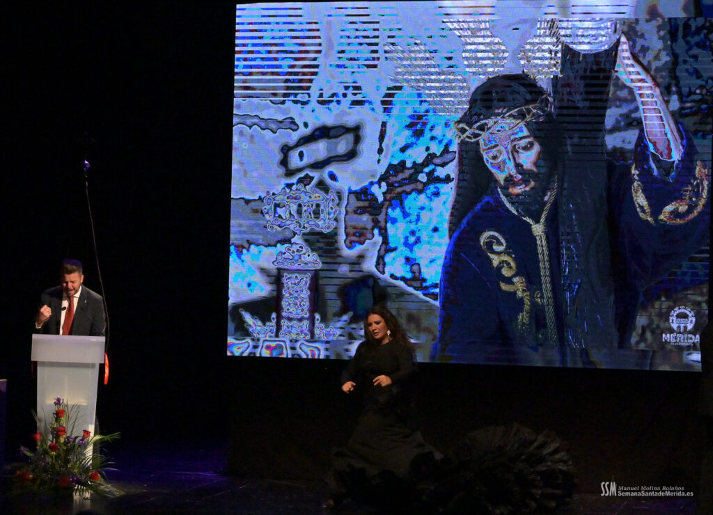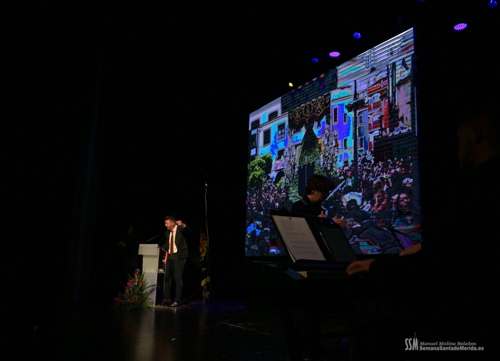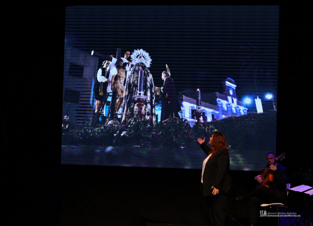 A ello se sumó el uso de imágenes proyectadas en gran formato, que envolvían el ambiente y sumergían al público en una atmósfera casi hipnótica. No eran simples acompañamientos visuales, eran parte del relato. Primeros planos, escenas cofrades, advocaciones marianas, recuerdos… todo proyectado con sensibilidad para amplificar cada palabra. Mérida no solo se escuchaba, sino que se veía, se sentía, se respiraba.