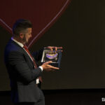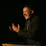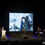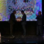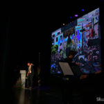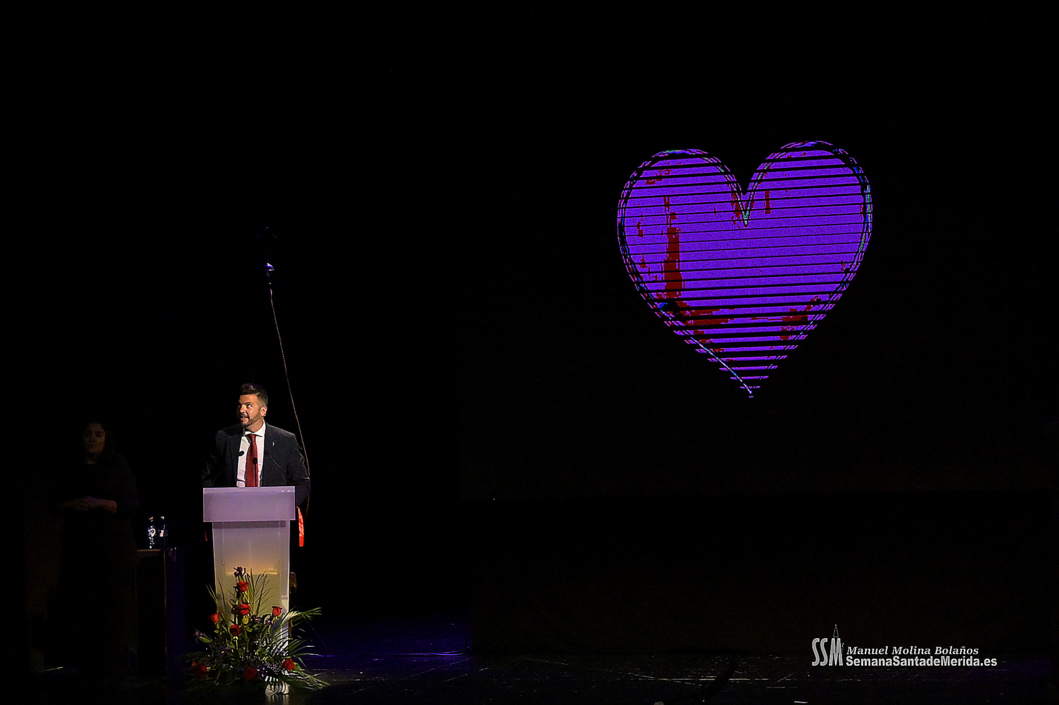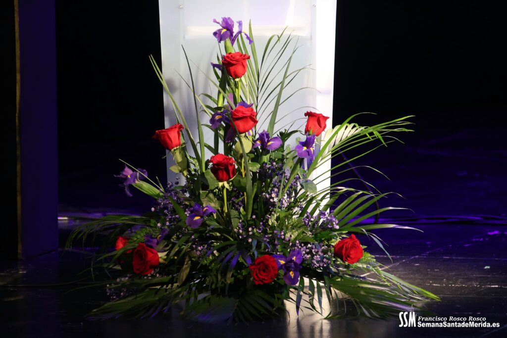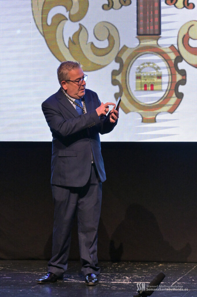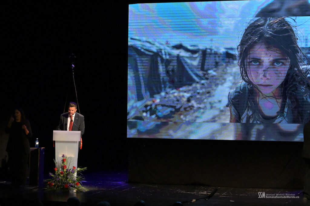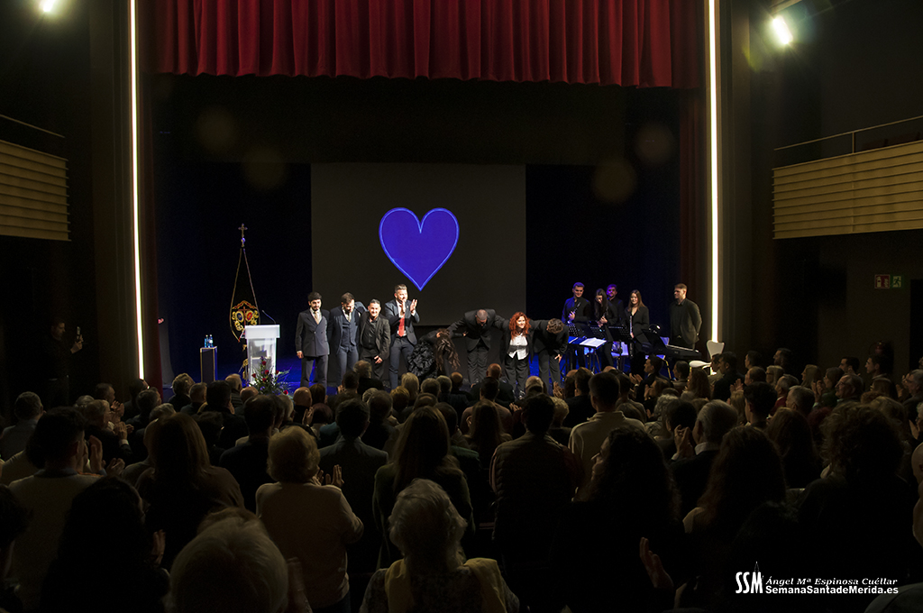 A ello se sumó el uso de imágenes proyectadas en gran formato, que envolvían el ambiente y sumergían al público en una atmósfera casi hipnótica. No eran simples acompañamientos visuales, eran parte del relato. Primeros planos, escenas cofrades, advocaciones marianas, recuerdos… todo proyectado con sensibilidad para amplificar cada palabra. Mérida no solo se escuchaba, sino que se veía, se sentía, se respiraba.