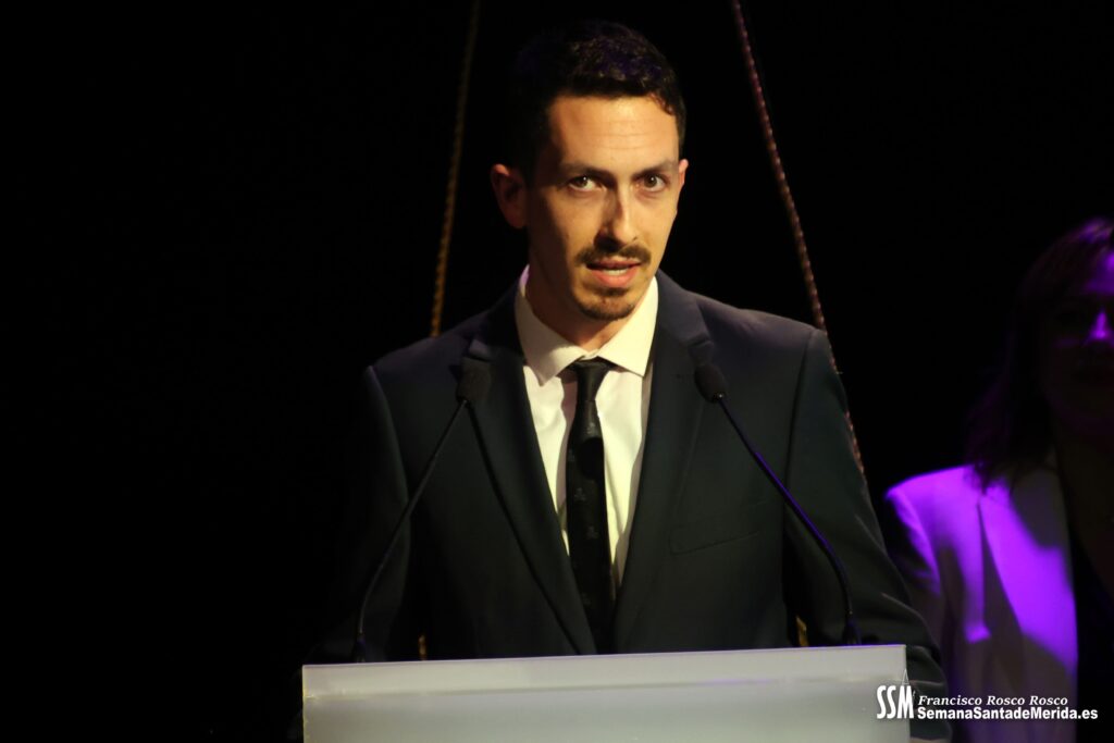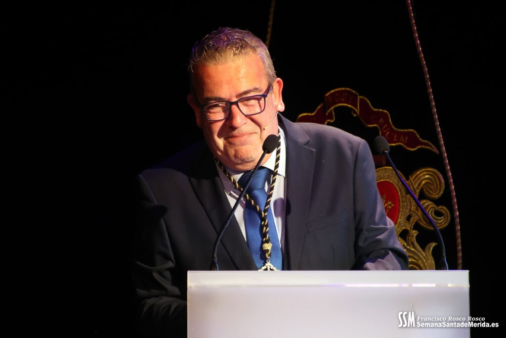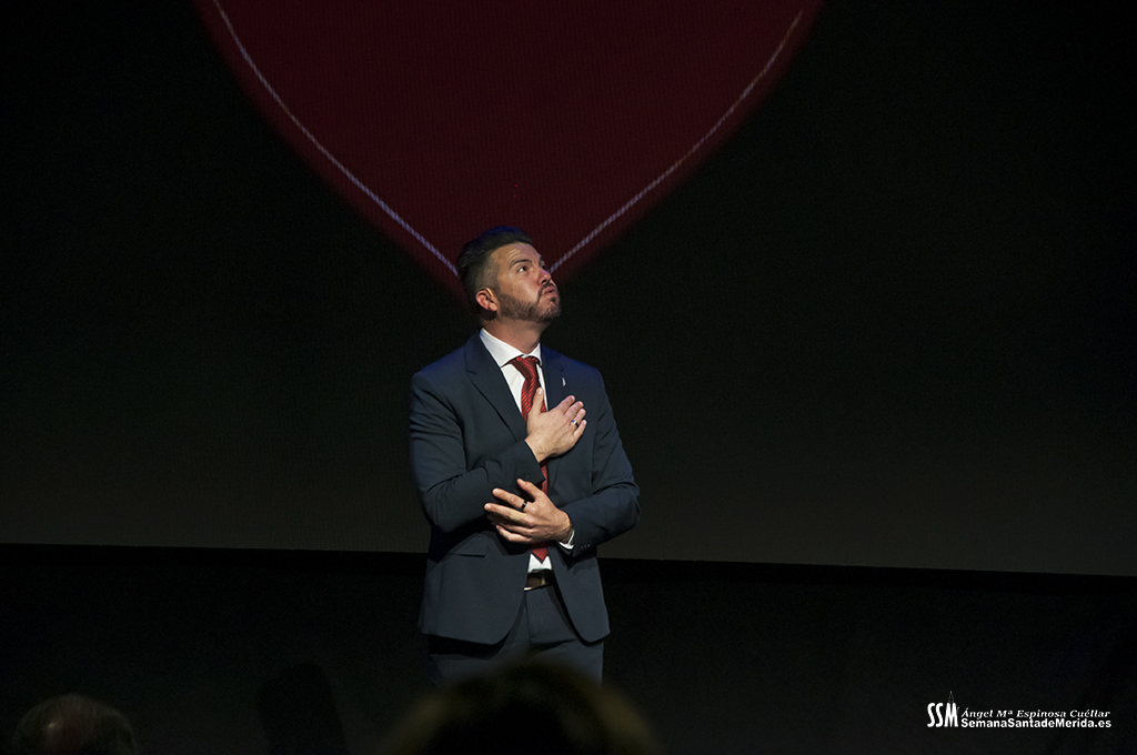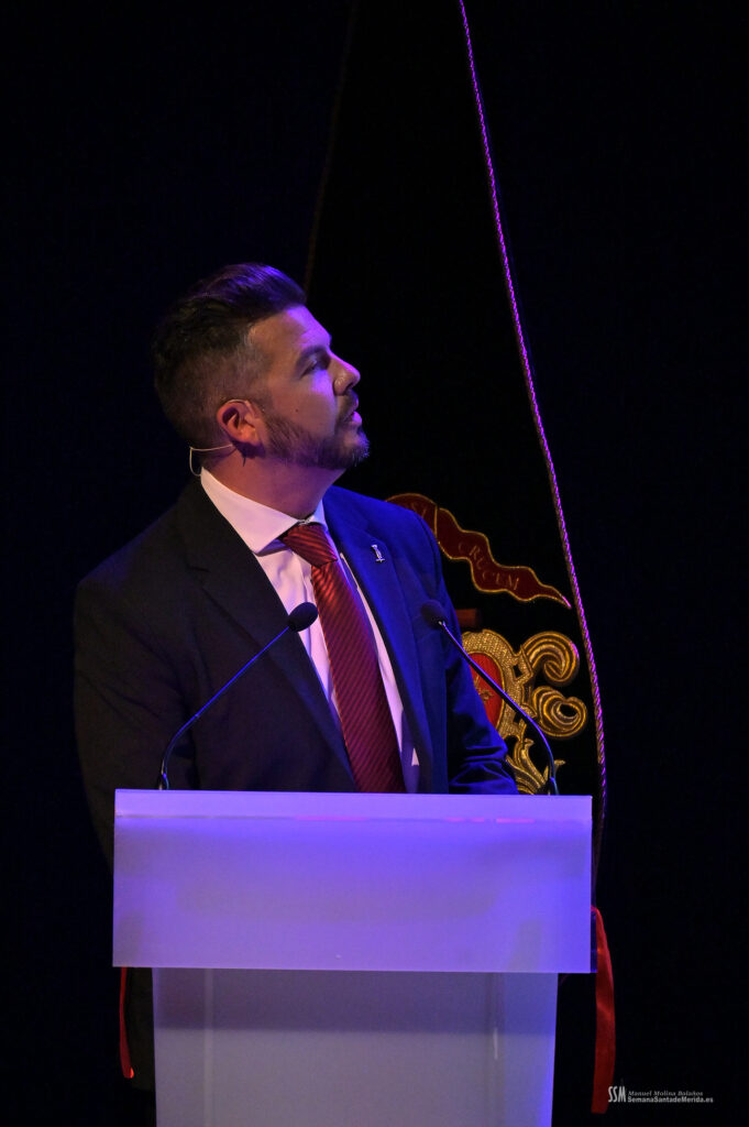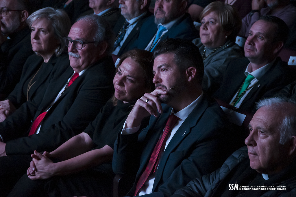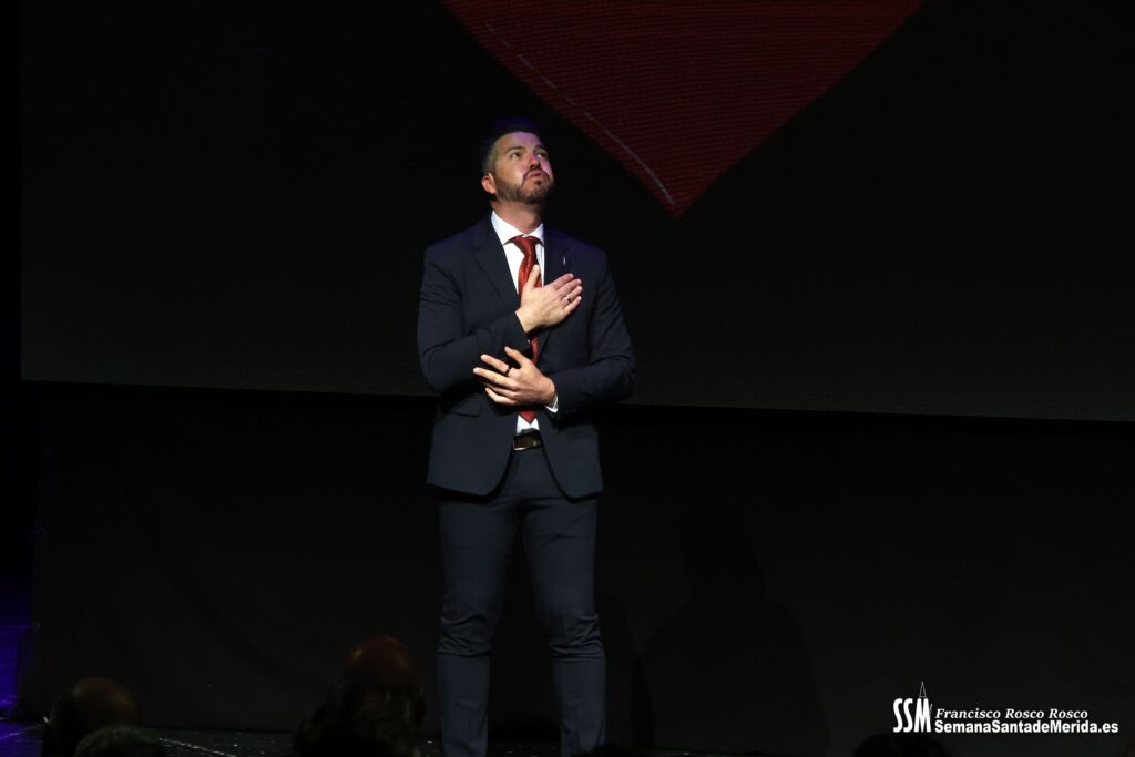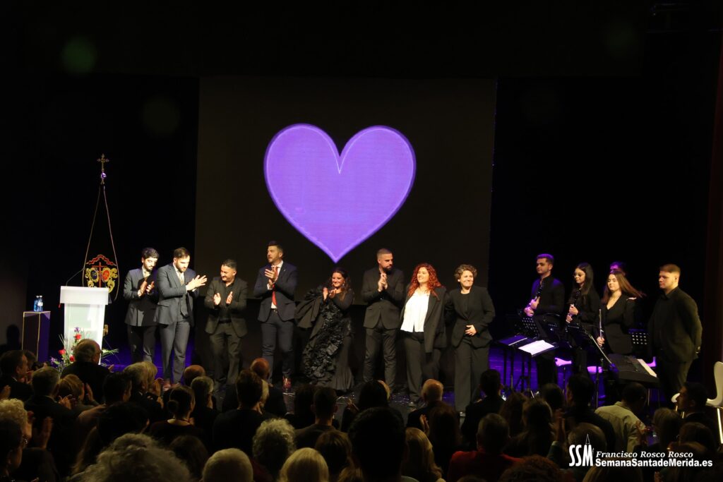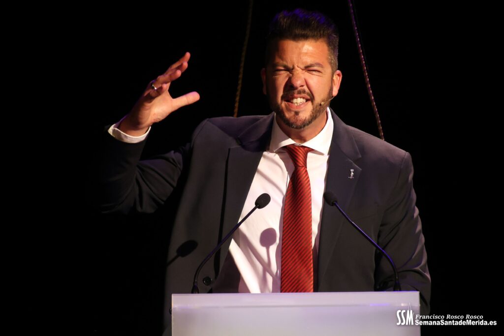 Mientras tanto, la Banda de Música de Mérida sostenía el armazón emocional de la noche. Sus intervenciones, perfectamente integradas, marcaban el ritmo del pregón, elevando cada bloque a una dimensión casi litúrgica.