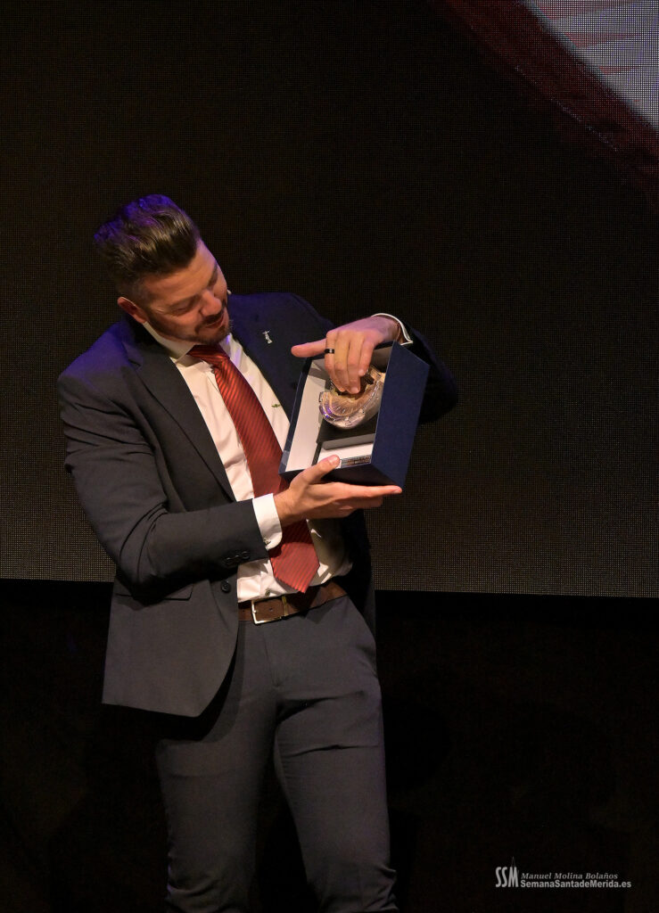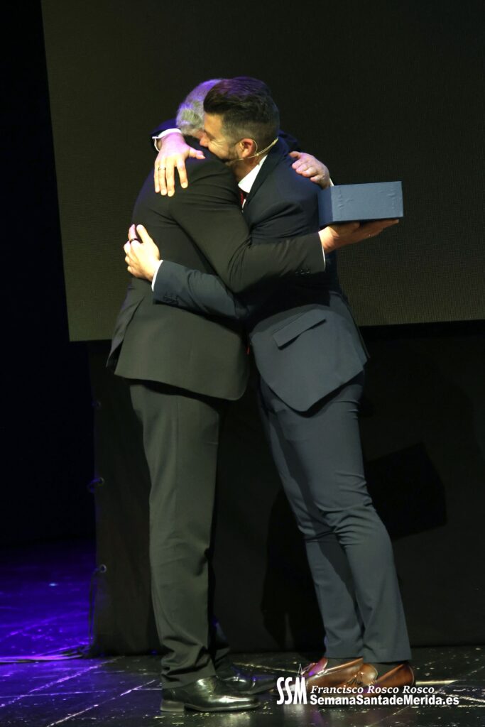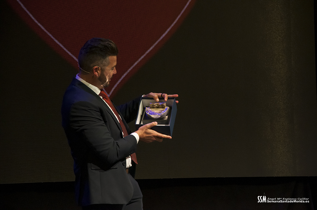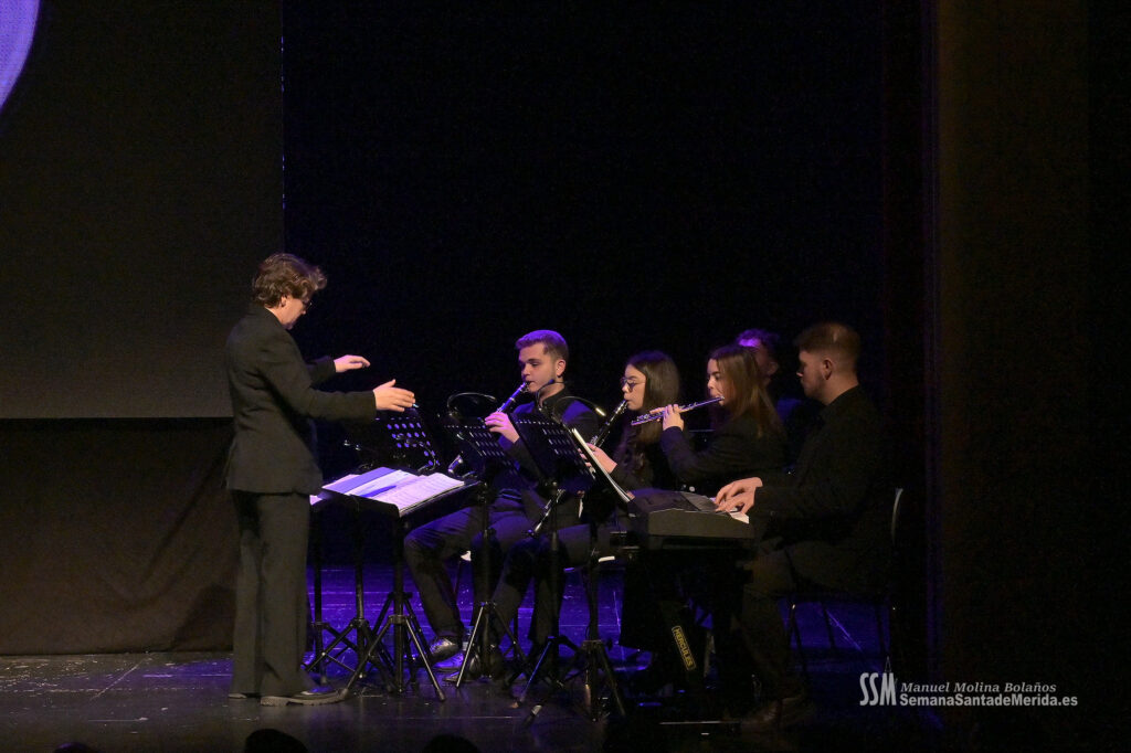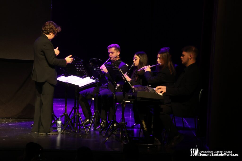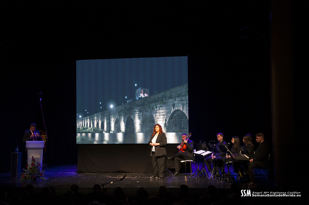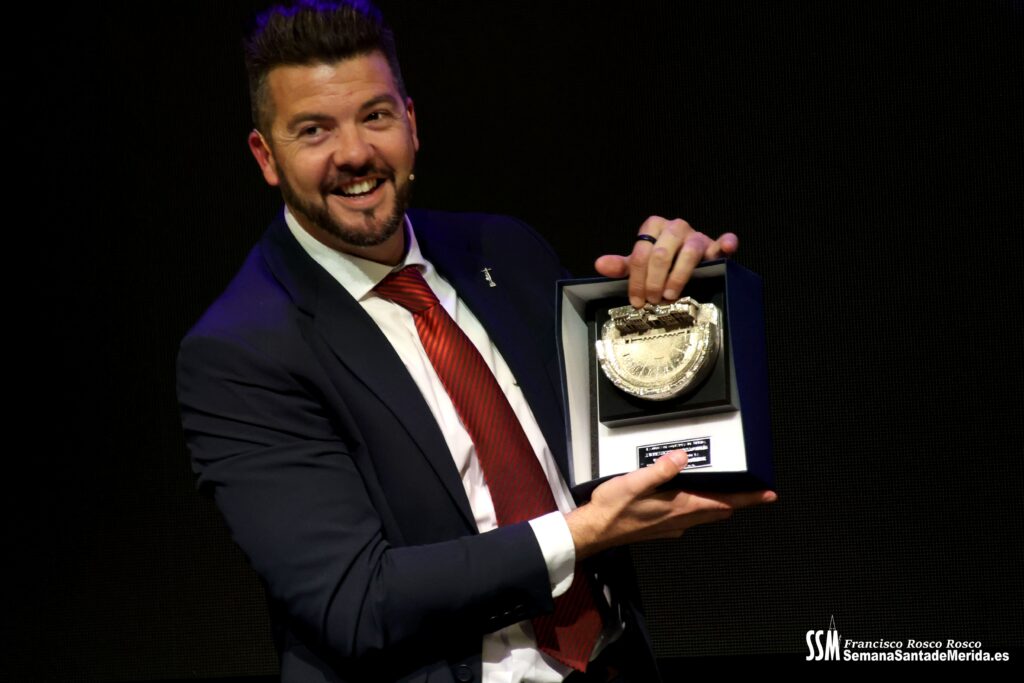 Mientras tanto, la Banda de Música de Mérida sostenía el armazón emocional de la noche. Sus intervenciones, perfectamente integradas, marcaban el ritmo del pregón, elevando cada bloque a una dimensión casi litúrgica.