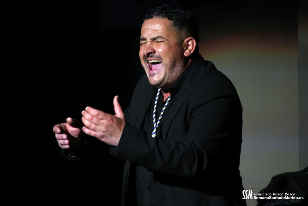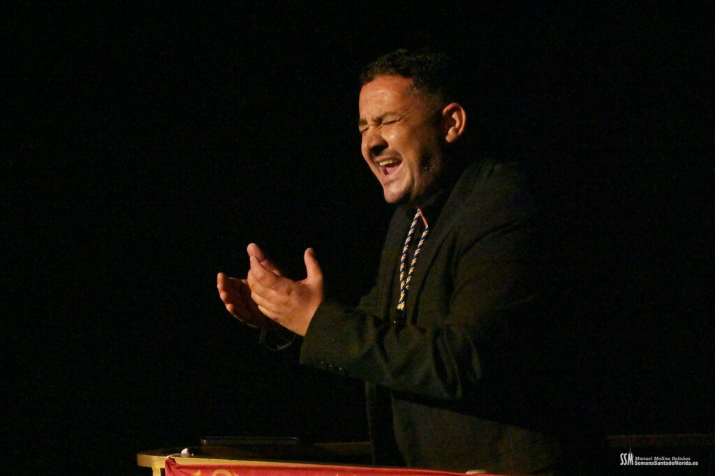 La saeta de Lolo Báez, dirigida al Cristo de los Remedios, encontró también en la iluminación y la imagen un aliado perfecto. El foco, preciso, aislaba el momento del resto del mundo. El silencio se hizo absoluto. Y en ese vacío lleno de sentido, la voz quebrada atravesó el teatro mientras la imagen del Cristo de los Remedios, en pantalla, acompañaba cada quejío. “Mi Semana Santa son también mis ausencias”, había dicho el pregonero. Y allí, con la luz detenida en el dolor, se entendió todo.
