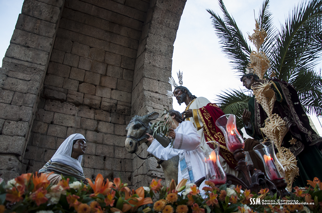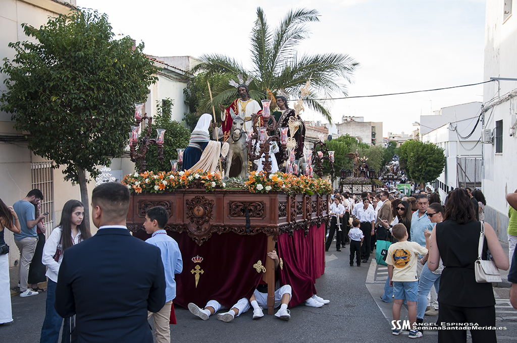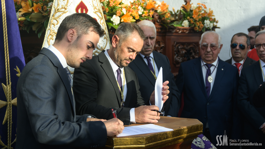 La tarde comenzó solemne con la rúbrica del acuerdo de cesión, por parte de la Hermandad del Calvario a la Cofradía Infantil, del grupo escultórico de la Entrada en Jerusalén que se realizó momentos antes del inicio del cortejo procesional. De esta manera, y en presencia de cinco ex Hermanos Mayores de la Hermandad del Calvario, y un ex Hermano Mayor de la Cofradía Infantil, ante sus Juntas de Gobierno, y el público asistente, se reafirmó el hermanamiento entre ambas hermandades, no en vano, los infantiles son los herederos del Calvario, fruto de la semilla sembrada en su día, como en la parábola del grano de mostaza.