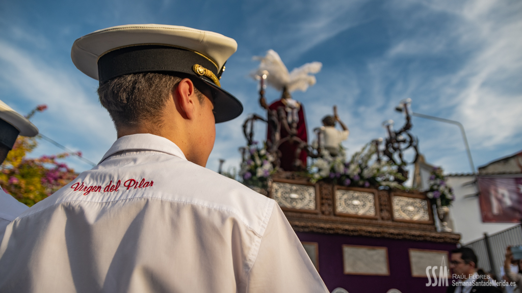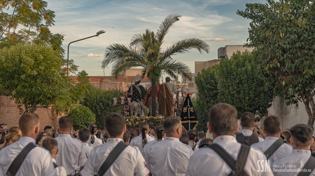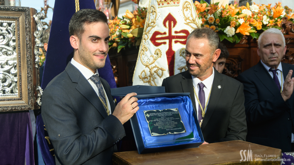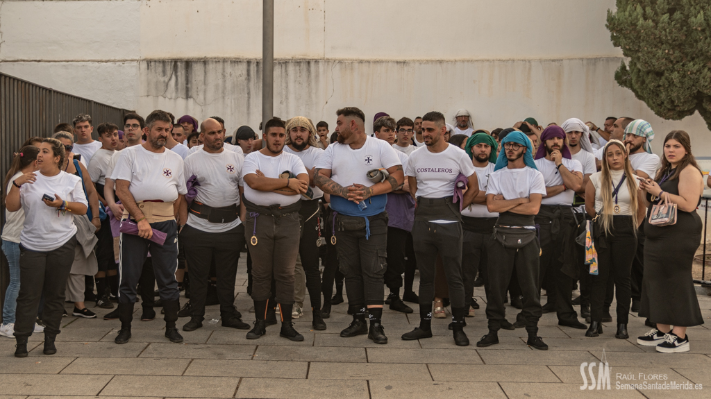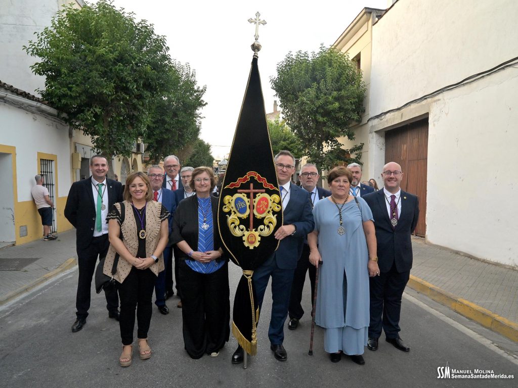 A partir de ahí, las numerosas insignias de la hermandad centenaria fueron conformando los tramos de cada uno de los pasos que participaron en el magno cortejo. De esta manera, el Libro de Reglas de la hermandad antecedía al paso de la Oración en el Huerto, con el Cristo luciendo su túnica primitiva, a los sones de la Banda de Cornetas y Tambores de la OJE de Mérida.
