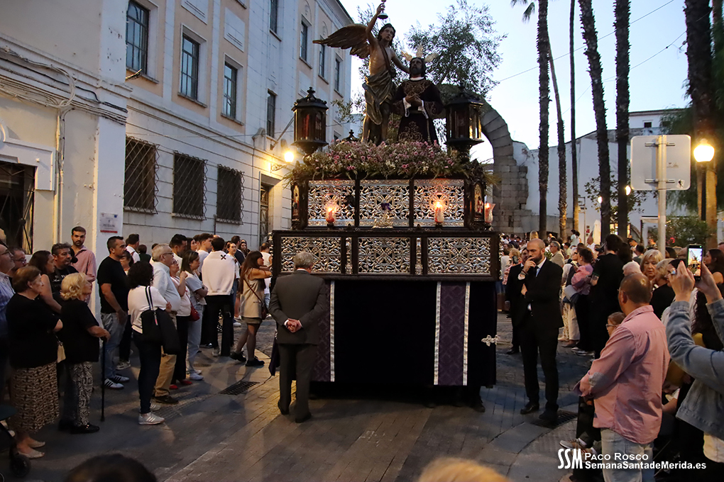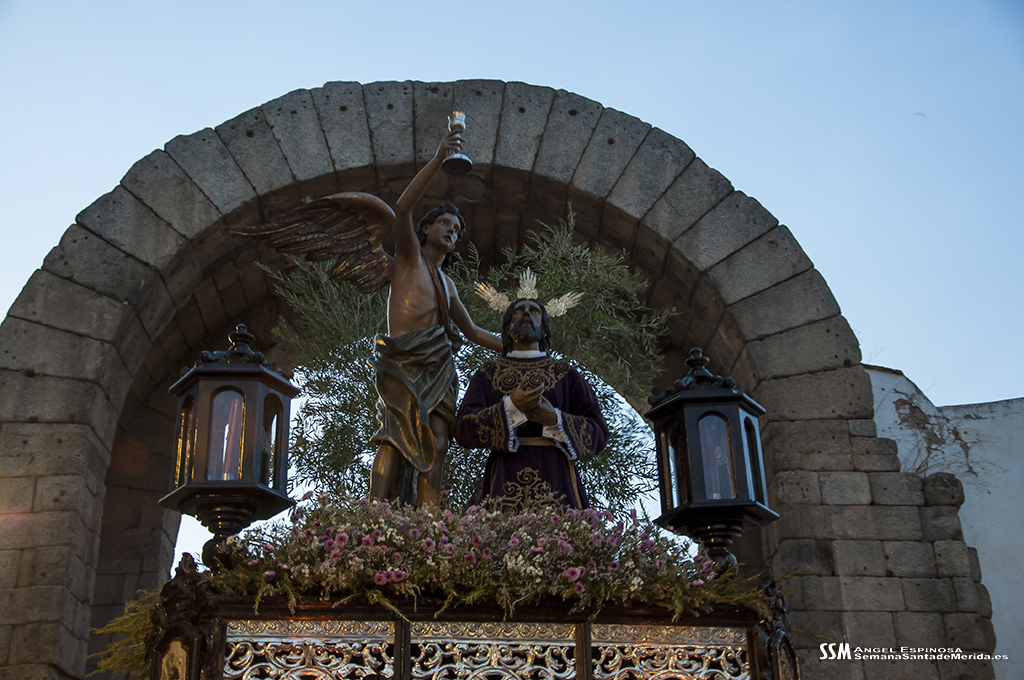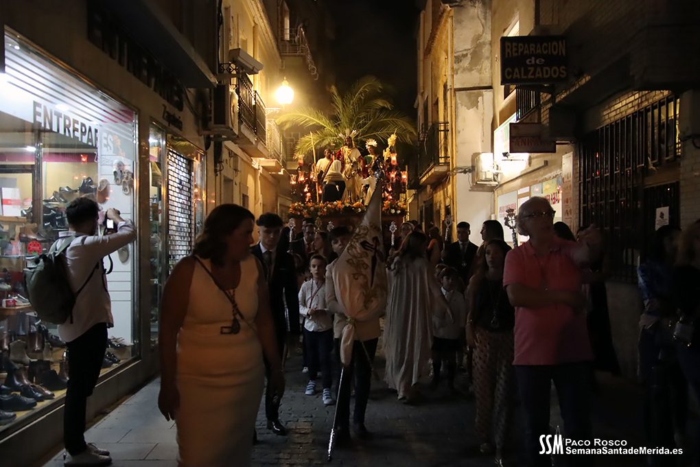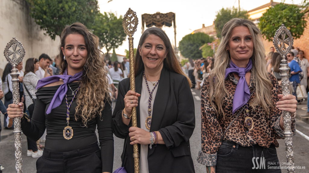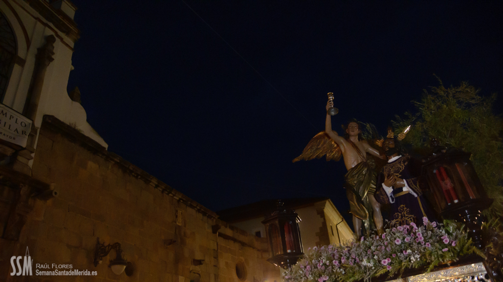 A partir de ahí, las numerosas insignias de la hermandad centenaria fueron conformando los tramos de cada uno de los pasos que participaron en el magno cortejo. De esta manera, el Libro de Reglas de la hermandad antecedía al paso de la Oración en el Huerto, con el Cristo luciendo su túnica primitiva, a los sones de la Banda de Cornetas y Tambores de la OJE de Mérida.