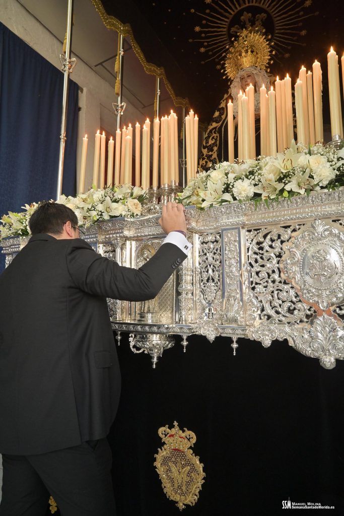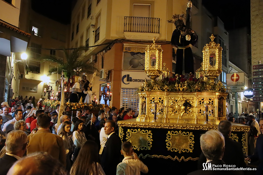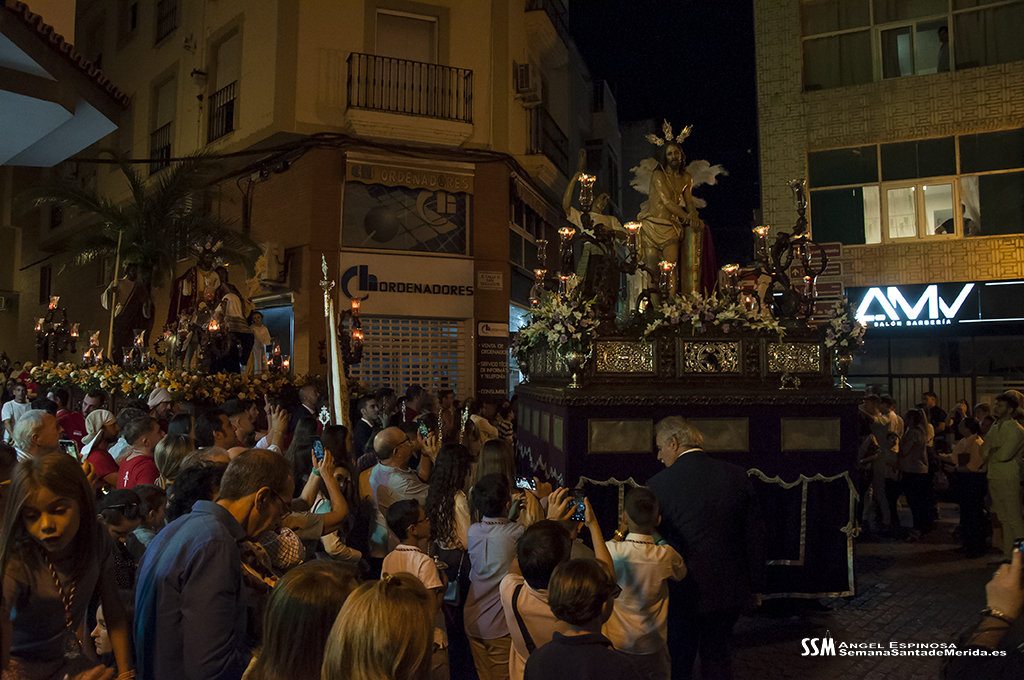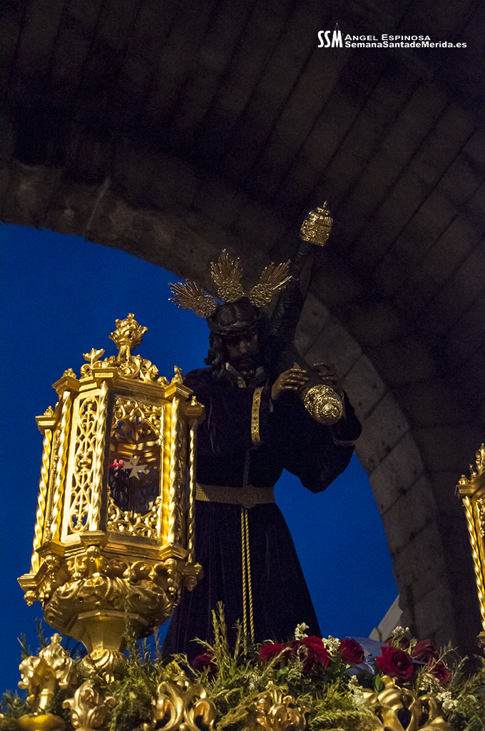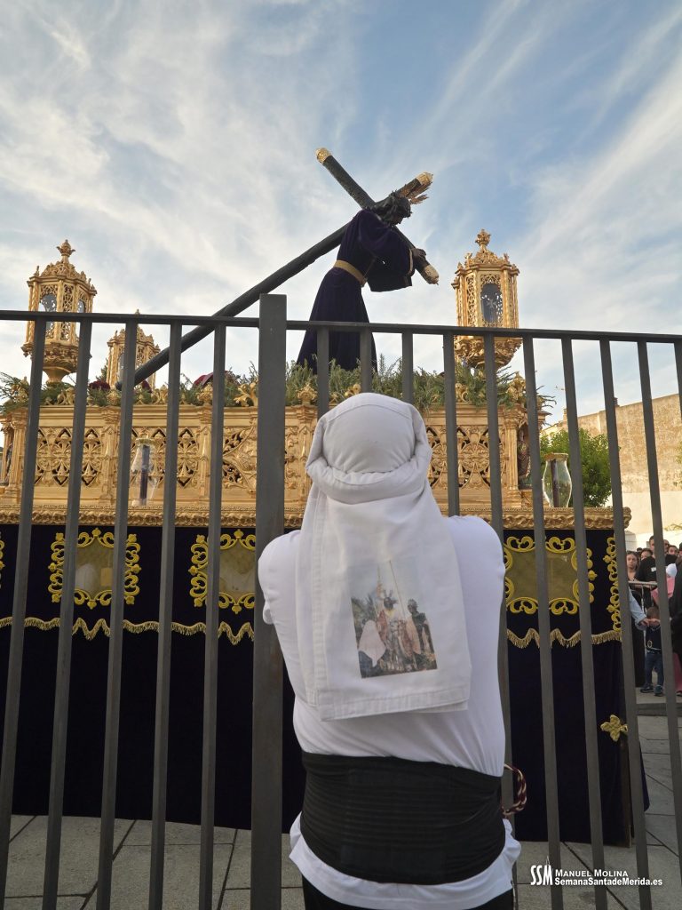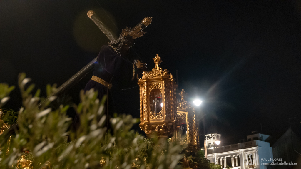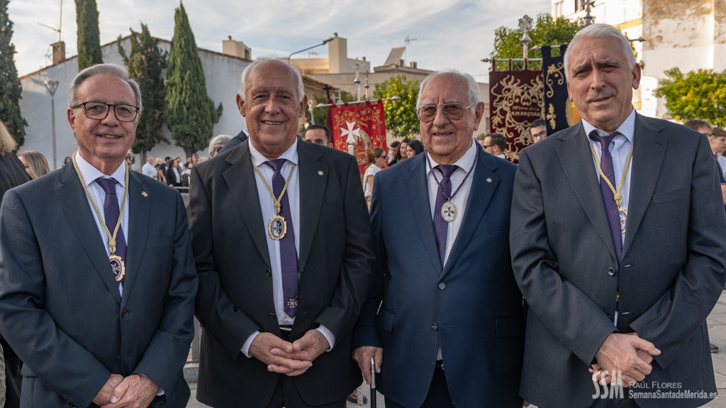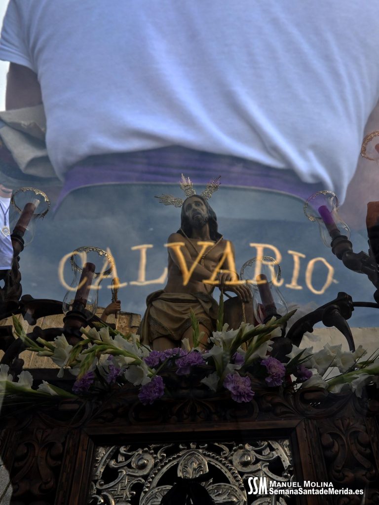 En silencio, avanzaba el Santísimo Cristo del Calvario, origen de la Cofradía, en su urna de plata de Meneses. Una estampa que lleva repitiéndose en Mérida durante siglos, por ello hablamos de historia, no solo de la Hermandad, sino de su Ermita, su calle… etc. Y delante del paso, el hermano mayor más antiguo de la Hermandad, D. Ángel de las Heras Espino, quién a su vez fuera su capataz, sin perder detalle del avanzar del mismo y, sobre todo, rubricando la historia de la Hermandad, refrendada por sus sucesores, Isidro Anguas y Fernando Carrasco, que avanzaban ante el paso del Nazareno o Antonio Chaparro, en la Virgen de los Dolores ¡Toda una lección de historia cofrade.