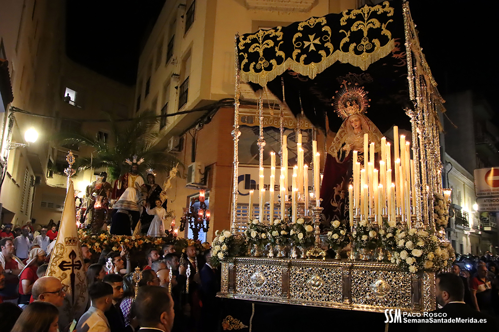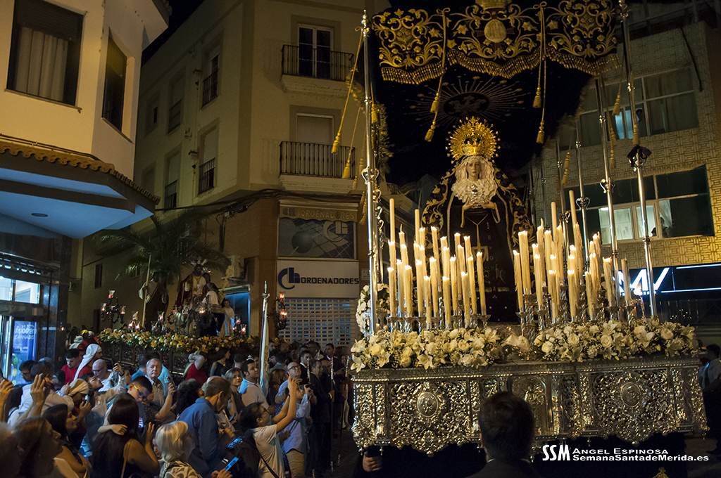 Finalmente llegó, oficialmente, la Hermandad del Calvario. El estandarte de la Virgen de los Dolores abría el último tramo, como cada Viernes Santo, anunciando la presencia de quien, por acuerdo plenario, es la ,»Señora de Mérida». La Banda de Música de Mérida aportaba sus acordes al solemne y elegante caminar de la Virgen de los Dolores contrastado con el soberbio andar de la Virgen de la Amargura, que era todo un derroche de alma de barrio.